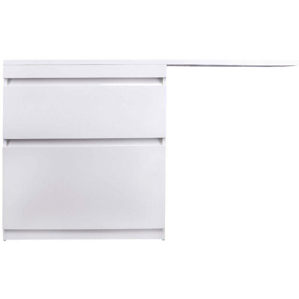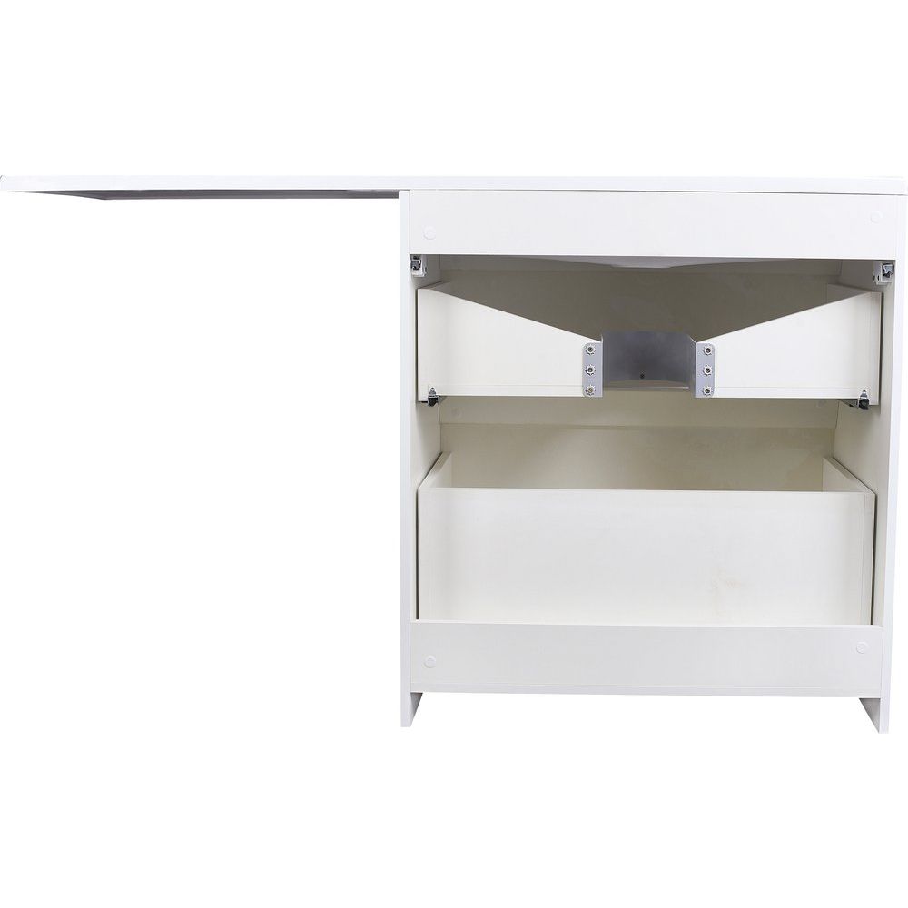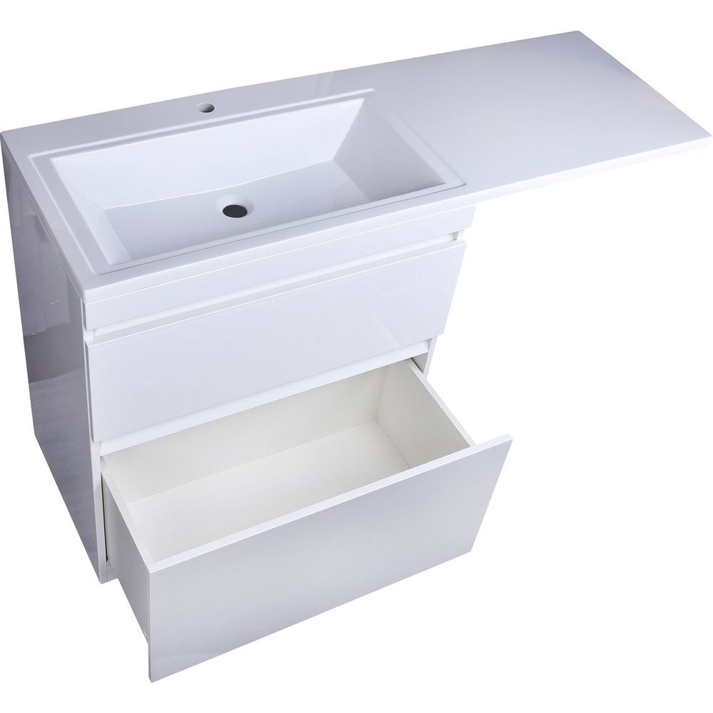 Комплект включает в себя напольную тумбу двухъярусной конструкции и мебельную раковину. Габариты тумбы составляют 77x48x85,5 см, а её корпус и фасад выполнены из прочного МДФ с обрамлением из пленки. Оснащена доводчиками для плавного закрытия ящиков. Напольная тумба оборудована опорными ножками для стабильности.