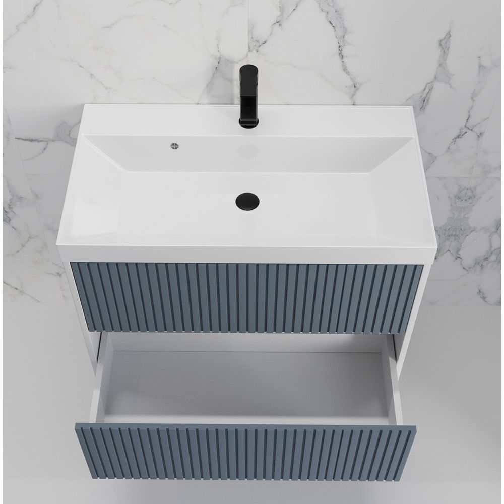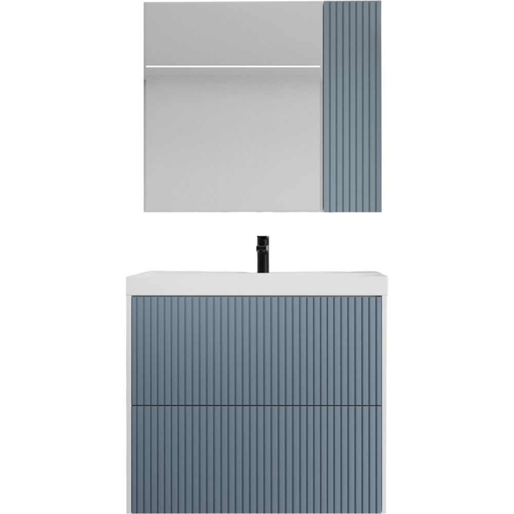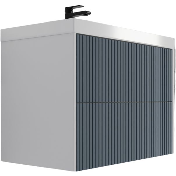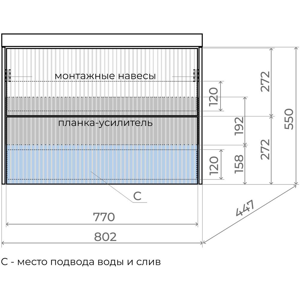 Тумба выполнена из МДФ с пленочным покрытием, что обеспечивает высокую стойкость к влаге и долговечность. Этот материал также используется для фасада. Габариты тумбы составляют 80,2x44,7x55 см, что делает её функциональной и вместительной. Подвесной монтаж добавляет лёгкости и позволяет сохранить чистоту пола.