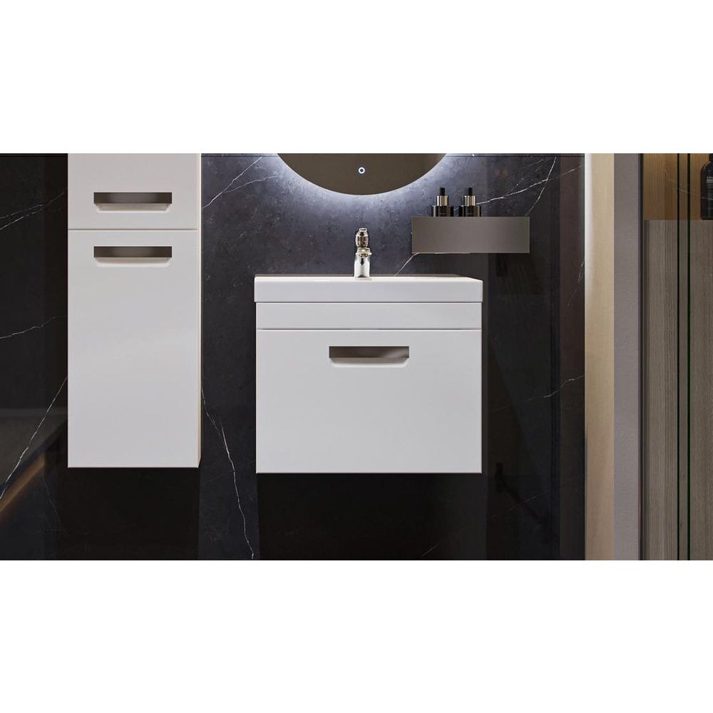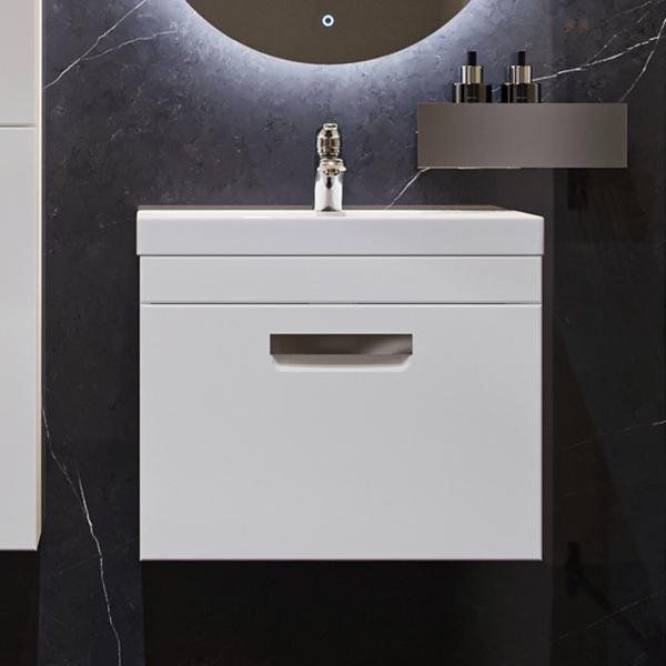 Размеры тумбы — 59,3x45,3x45 см, она выполнена из МДФ с пленочным покрытием и оснащена хромированной фурнитурой. В комплект входит мебельная раковина Cersanit Como, размером 60x45 см, изготовленная из прочного фарфора. Комплект также включает в себя встроенный слив-перелив и готовое отверстие под смеситель. Однако донный клапан необходимо приобрести отдельно. Оба продукта произведены в России и идут с гарантией — 3 года на тумбу и 10 лет на раковину.