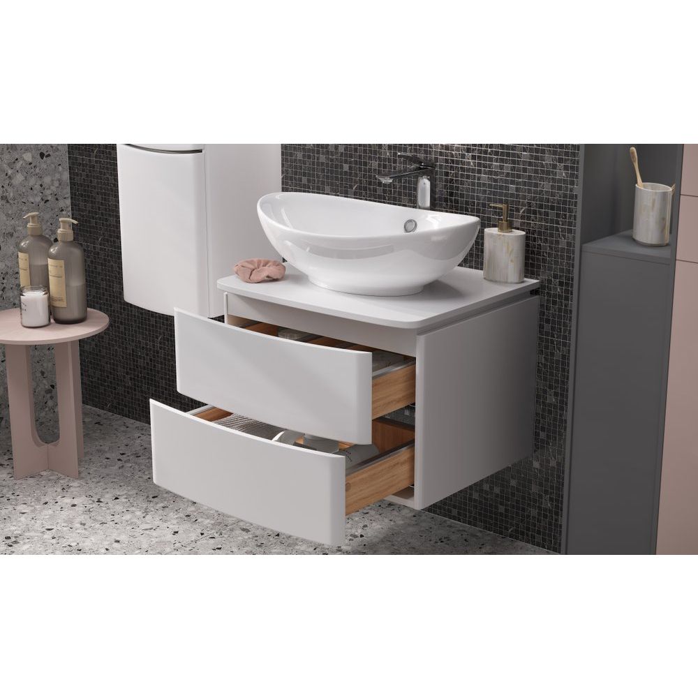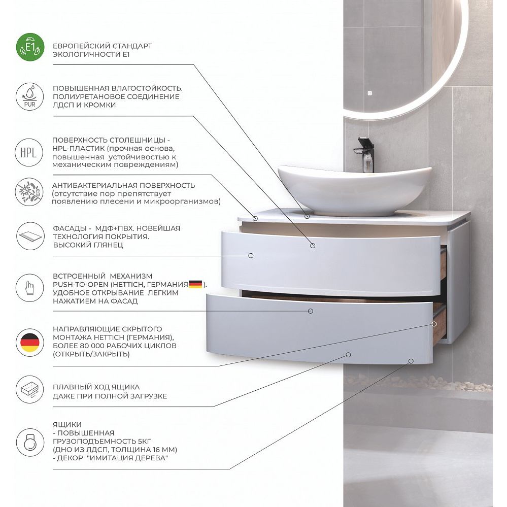 - Высококачественные материалы и надежность: тумба из водостойкого МДФ и прочный фаянс раковины.