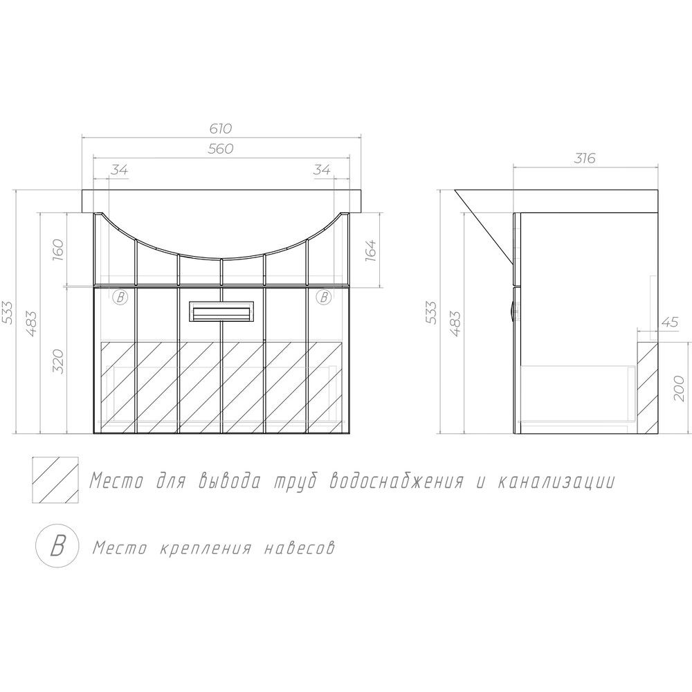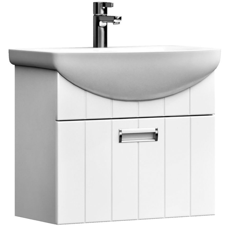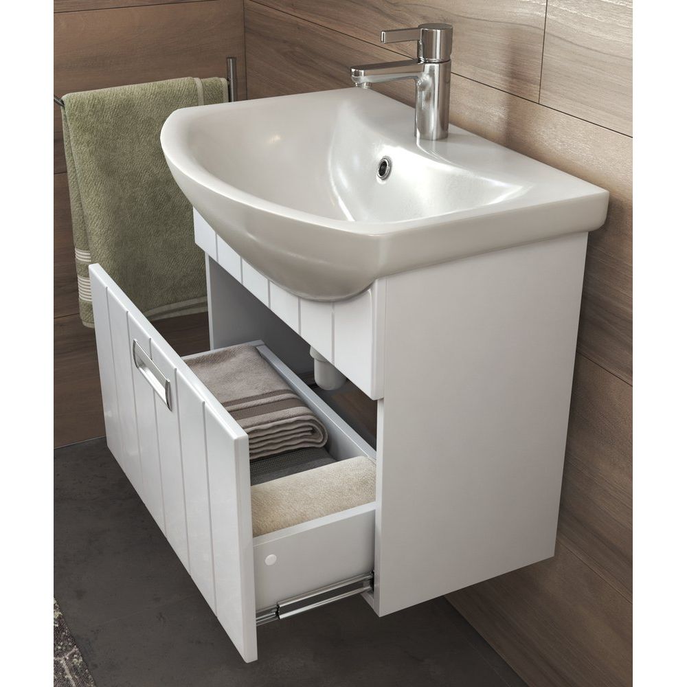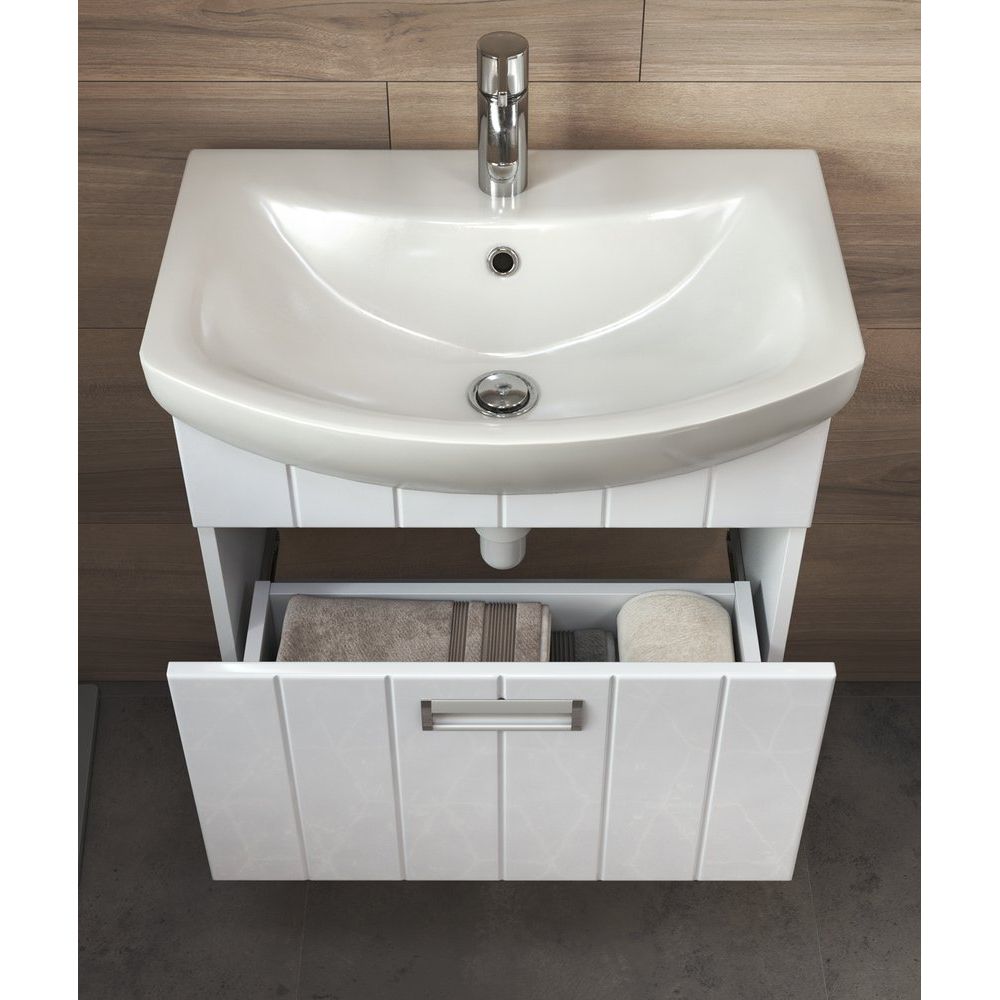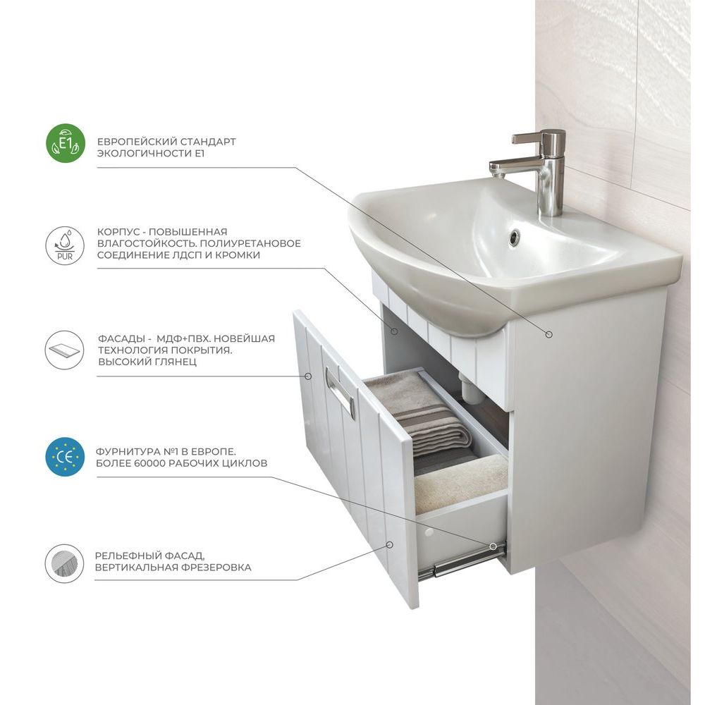 Тумба Vigo Diana 60 имеет размеры 56x31,6x48,3 см и подвесную конструкцию, что обеспечивает легкость установки и ухода за полом в ванной комнате. Удобный механизм доводчика делает использование ящиков особенно комфортным. Она изготовлена из ЛДСП с ламинатным покрытием, что придает прочность и устойчивость к внешним воздействиям. Фасад выполнен из МДФ и покрыт пленкой для дополнительной защиты. Раковина Santek Балтика 60 изготовлена из прочного фарфора и оснащена встроенным сливом-переливом, а также одним готовым отверстием под смеситель.