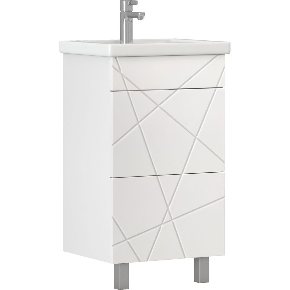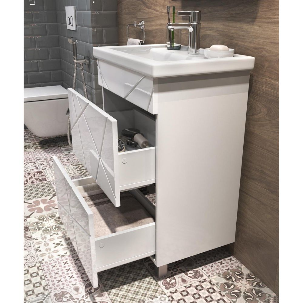 Тумба Vigo Geometry выполнена из ЛДСП с ламинатным покрытием, что придаёт ей прочность и долговечность. Дизайнерский фасад из МДФ покрыт пленкой для защиты от влаги и повреждений. Она имеет размеры 47x39x80 см, что позволяет идеально вписаться в небольшой санузел. В комплект входит сифон, но без возможности установки донного клапана. Раковина Kirovit Фостер 50 из фарфора оснащена встроенным слив-переливом и характеристиками, которые делают её идеальной парой для тумбы. Габариты раковины — 50x40 см, и она предусмотрена для установки смесителя с диаметром сифона 3.2 см.