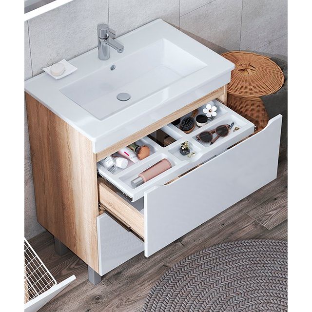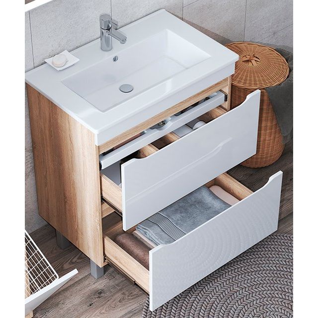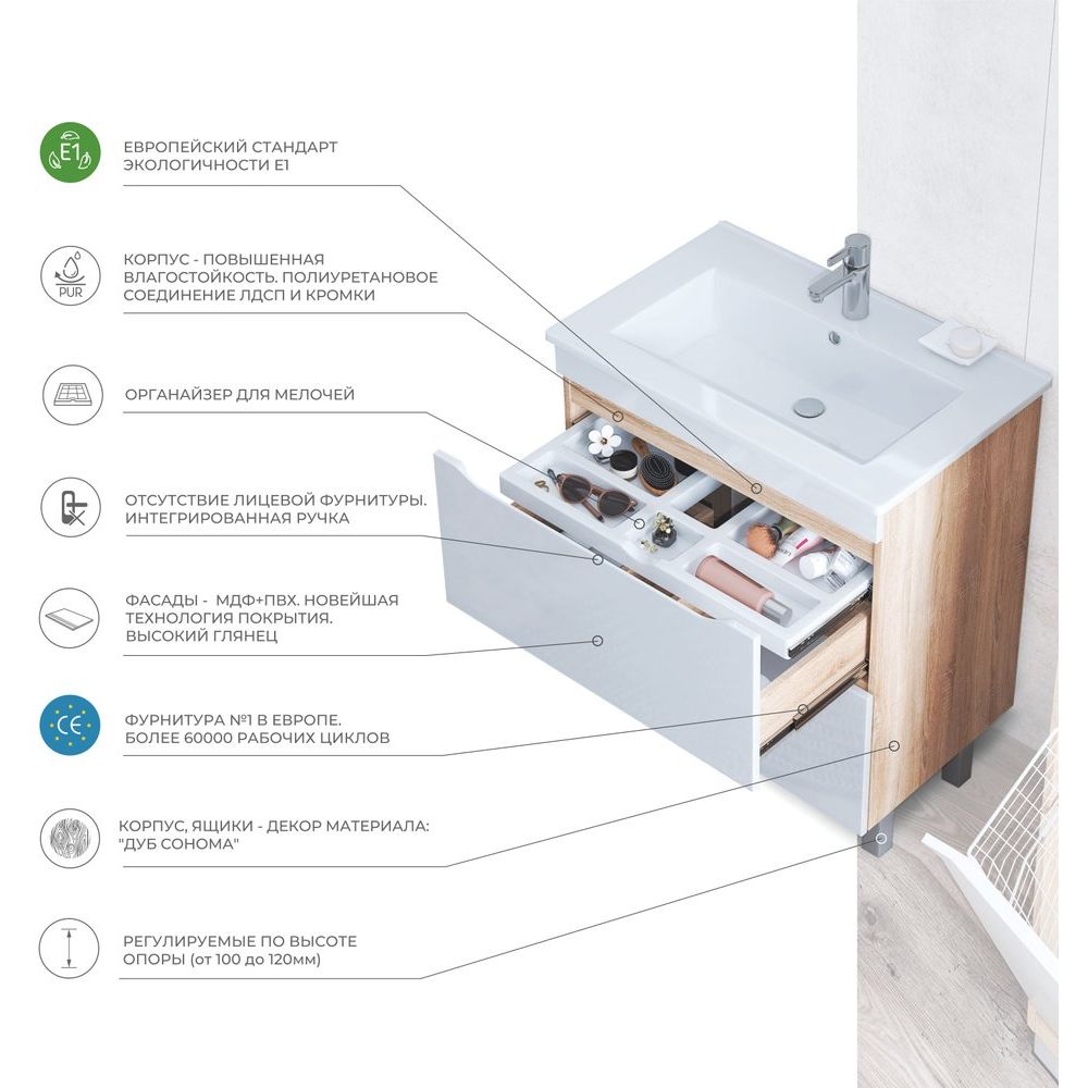 Тумба с раковиной Vigo Grani 75 — это идеальное сочетание современных технологий и элегантного дизайна. Напольная конструкция выполнена в стильном цвете дуб сонома, что привносит тепло и уют в интерьер вашей ванной комнаты. Два вместительных ящика обеспечивают удобное хранение всех необходимых принадлежностей. Эта модель не только функциональна, но и эстетически привлекательна, подчеркивая вашу заботу о деталях и стиль.