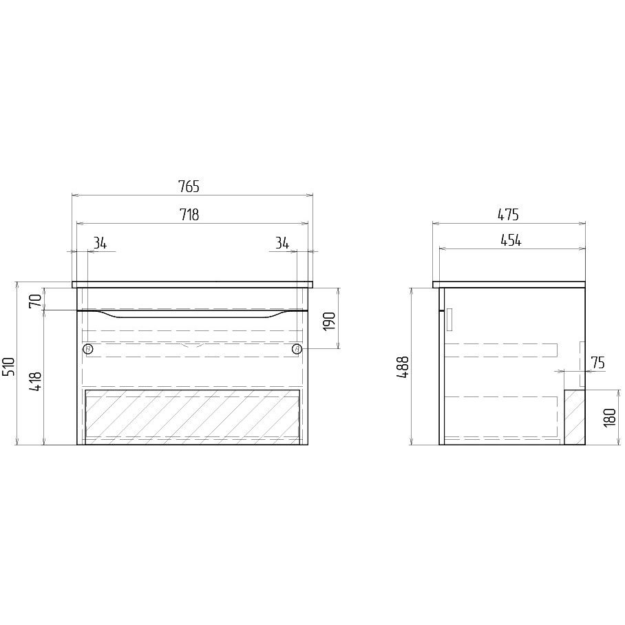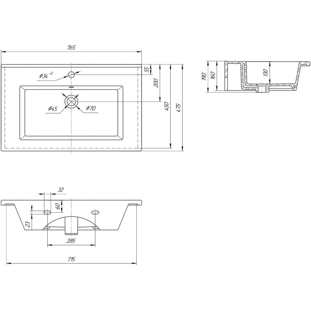 Тумба Vigo Grani 75 имеет размеры 71,8x45,4x48,8 см и оборудована одним выдвижным ящиком. Она выполнена из ЛДСП с ламинатным покрытием для защиты от влаги. Подвесная тумба без механизма доводчика, в комплекте с сифоном и мебельной раковиной Kirovit Оскар 75. Раковина размером 76,5x47,5 см изготовлена из высококачественного фаянса и имеет встроенный слив-перелив. Одна прорезь под смеситель добавляет комфорта. Донный клапан приобретается отдельно.