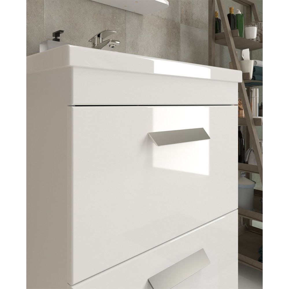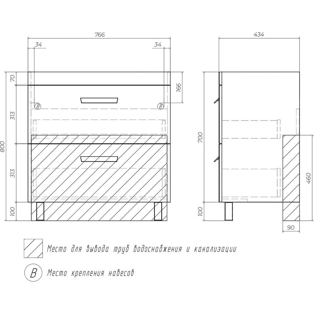 Тумба в комплекте Vigo Nova имеет два вместительных ящика. Ее габариты составляют 76,6x43,4x80 см, с установкой на пол. Корпус изготовлен из ЛДСП с ламинированным покрытием, а фасад из МДФ покрыт пленкой. Ящики оснащены направляющими полного выдвижения, однако механизм доводчика не предусмотрен. Цвет фурнитуры - хром.