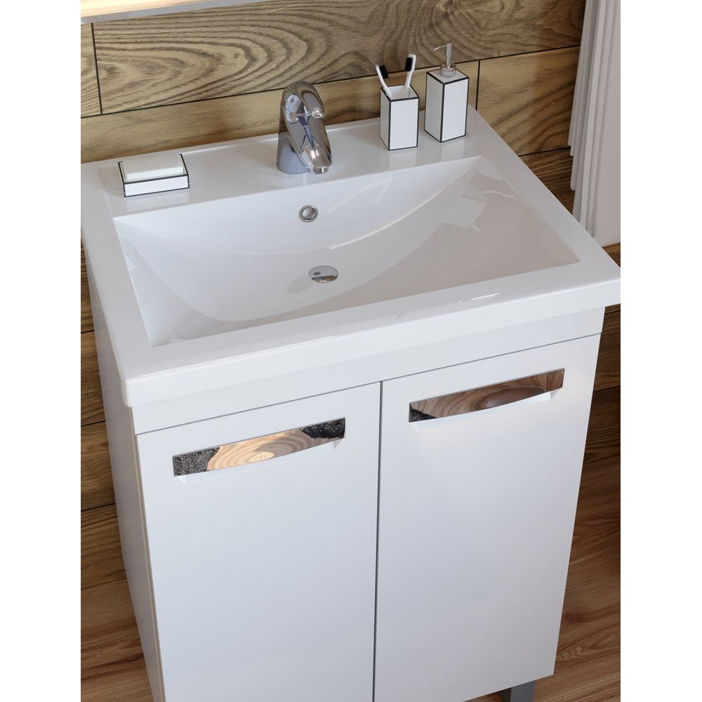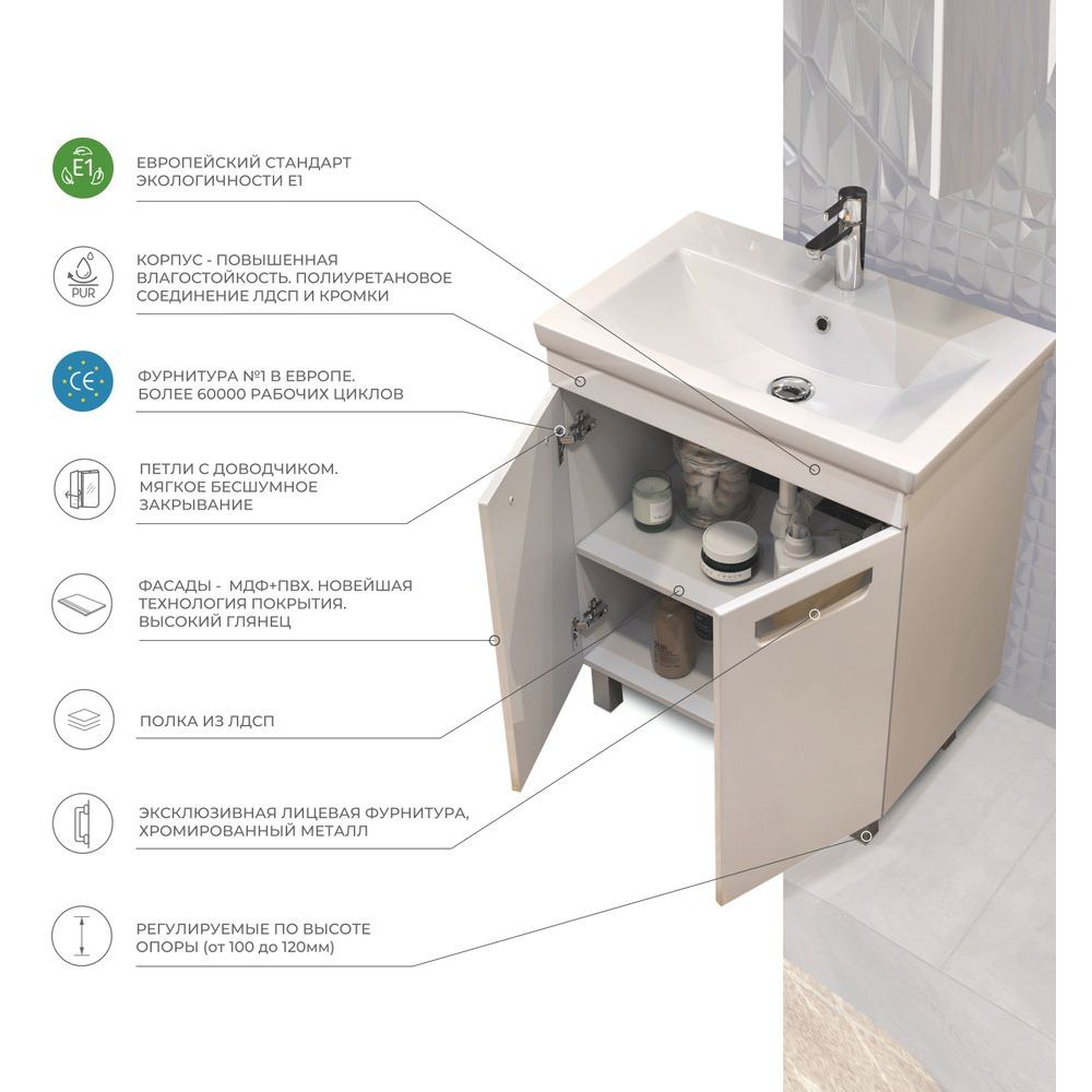 Тумба Vigo Plaza 60 с двумя дверцами выполнена из прочного ЛДСП с ламинированным покрытием и фасадом из МДФ, защищённого плёнкой. Она имеет размеры 56,6x38,6x80 см и оснащена регулируемыми по высоте ножками, что позволяет адаптировать её под любые неровности пола. Хромированная фурнитура придаёт изделию стильный акцент.