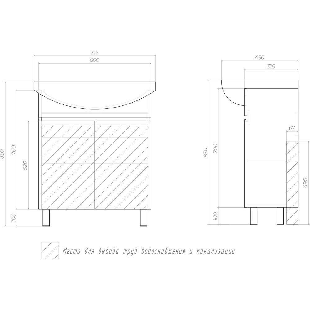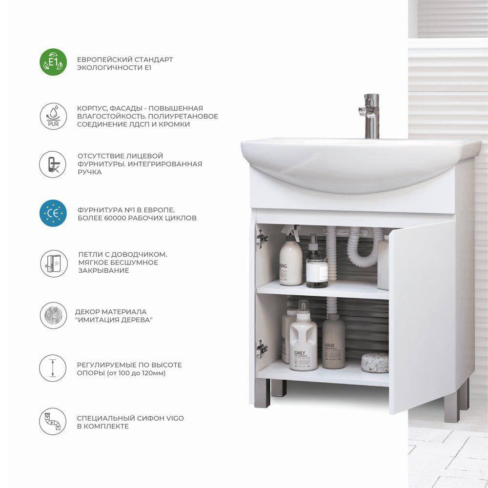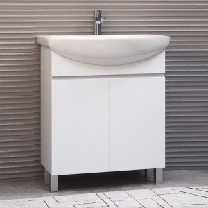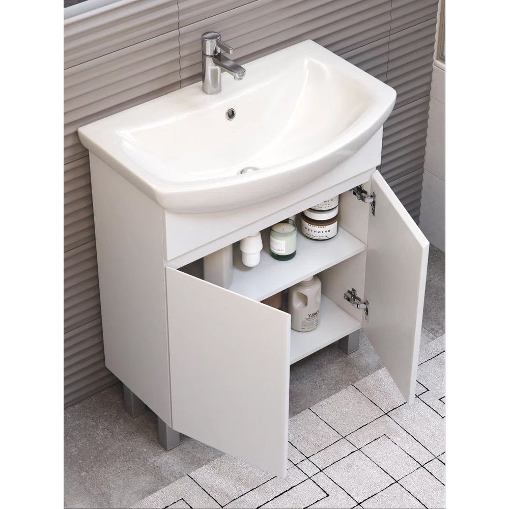 Тумба Vigo Wing 70 выполнена из ламинированного ЛДСП, что придаёт ей долговечность и устойчивость к влаге. Напольная конструкция имеет размеры 66x31,6x80 см. Дополняют её отделения с дверками и съемные полки, которые позволяют организовать пространство внутри. Мебельная раковина Santek Балтика 70 изготовлена из прочного фарфора. Она имеет одно готовое отверстие под смеситель и совместима с сифоном диаметром 3.2 см. Сифон произведен из полипропилена и нержавеющей стали, снабжён гидрозатвором для предотвращения запахов, а также регулируется по высоте и длине. Все изделия сопровождаются национальной гарантией от 2 до 10 лет.