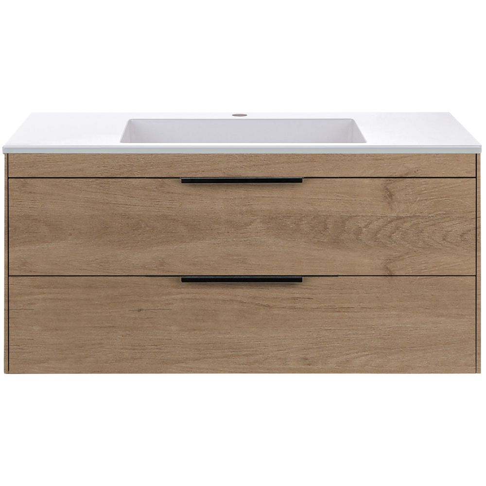 Тумба Vincea Chiara 2D с размерами 99x47,6x47,5 см выполнена из ЛДСП с ламинатным покрытием в цвете натурального дуба. Подвесная конструкция и два выкатных ящика с механизмом soft-close обеспечивают удобство в использовании. Фасады украшены черной фурнитурой, добавляющей утонченности. В комплекте идет мебельная раковина Vincea VCB-13100W из искусственного камня с размерами 100x48 см, оснащенная одним отверстием под смеситель. Донный клапан следует приобрести отдельно.