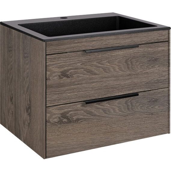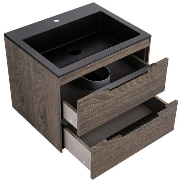 Тумба под раковину Vincea Chiara 2D выполнена в подвесном стиле, что обеспечивает визуальную легкость и облегчает уборку. Конструкция оснащена двумя выкатными ящиками, которые плавно закрываются благодаря механизму soft-close. Мебель изготовлена из ЛДСП с ламинатным покрытием, что обеспечивает долговечность и устойчивость к влаге. Фурнитура выполнена в черном цвете, добавляя стильный контраст. Габариты тумбы составляют 59,2x47,6x47,5 см, а раковины — 60x48 см. Раковина имеет готовое отверстие для смесителя и требует установки донного клапана, который приобретается отдельно.