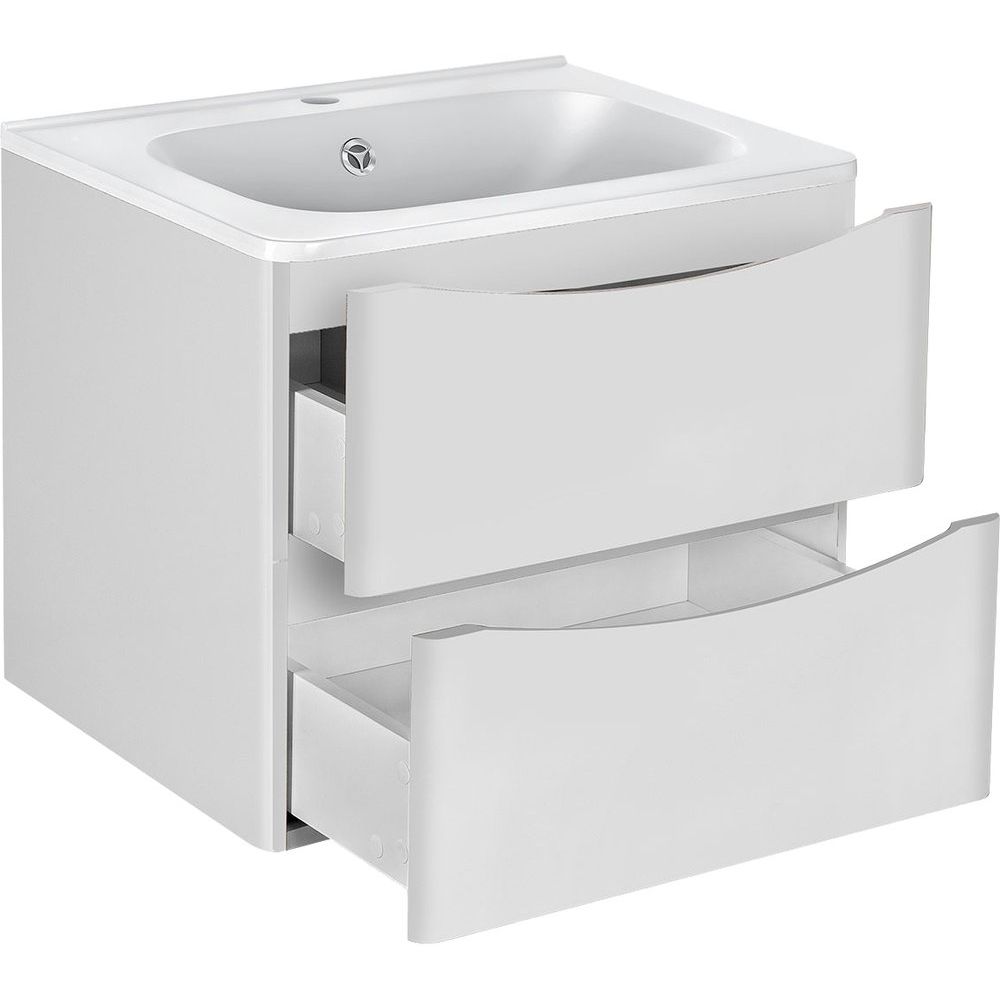 Тумба Vincea Paola имеет размеры 58,9x46,6x50 см, выполнена из ЛДСП с глянцевой пленкой, а фасад — из МДФ. Это подвесная модель, оборудованная механизмом доводчика, предлагающая достаточно места для хранения в ящиках. Раковина Vincea VCB-2VP600W размером 59,4x47,2 см изготовлена из искусственного камня. Она имеет одно готовое отверстие под смеситель и совместима с сифоном диаметром 3,2 см. Поставляется с комплектом слив-перелив, но для полноценной установки необходимо приобрести донный клапан отдельно.