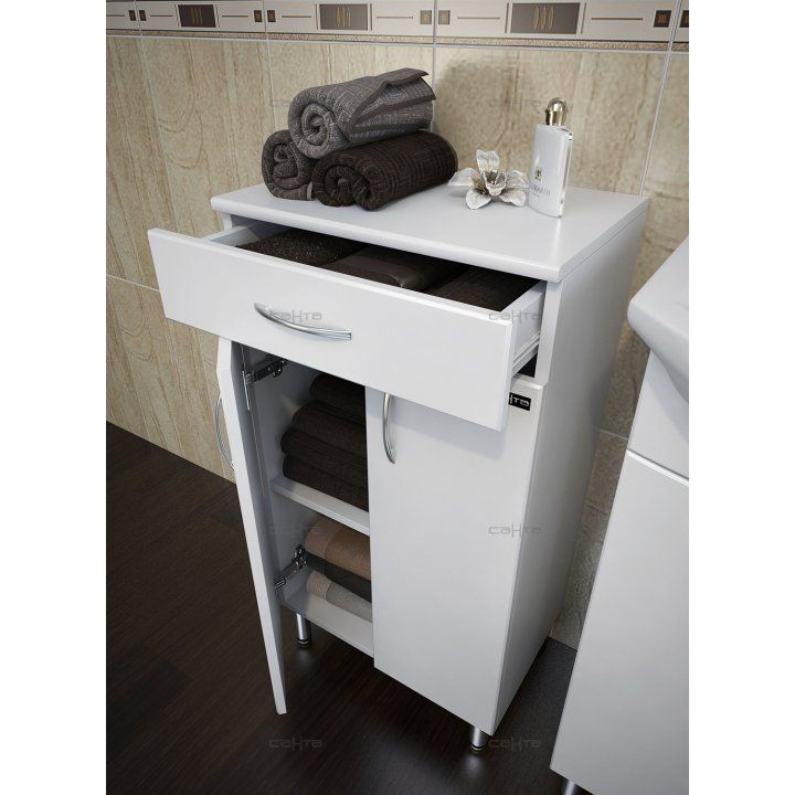 Позаботьтесь об удобстве и порядке в вашей ванной комнате с тумбой СаНта Стандарт TH 45. Эта вместительная и современная тумба обеспечивает рациональное хранение полотенец, косметики и других необходимых вещей благодаря продуманной конструкции из выдвижного ящика и трехсекционного отделения с распашными дверцами. Специальное ПВХ-покрытие защищает фасад от влаги, гарантируя долговечность и привлекательный вид изделия на долгие годы.