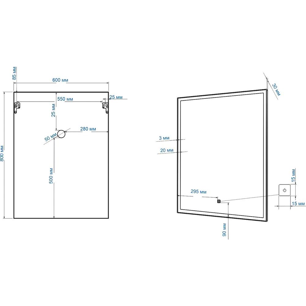 Зеркало имеет размеры 60 см в ширину и 80 см в высоту, при этом его толщина всего 3 см, что делает его компактным и удобным. Корпус изготовлен из пластика и алюминия, что обеспечивает долговечность и устойчивость к влаге. Встроенная подсветка дает возможность улучшить освещение в ванной комнате, а сенсорный выключатель позволяет легко включать и выключать свет одним касанием. Подвесы в комплекте делают установку еще проще.