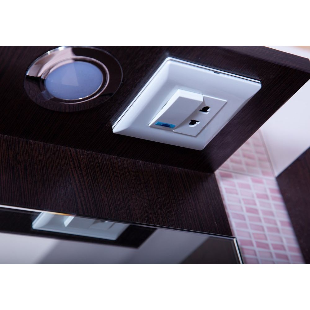 - Функциональность: зеркало оснащено встроенной подсветкой и удобной розеткой для подключения электроустройств.