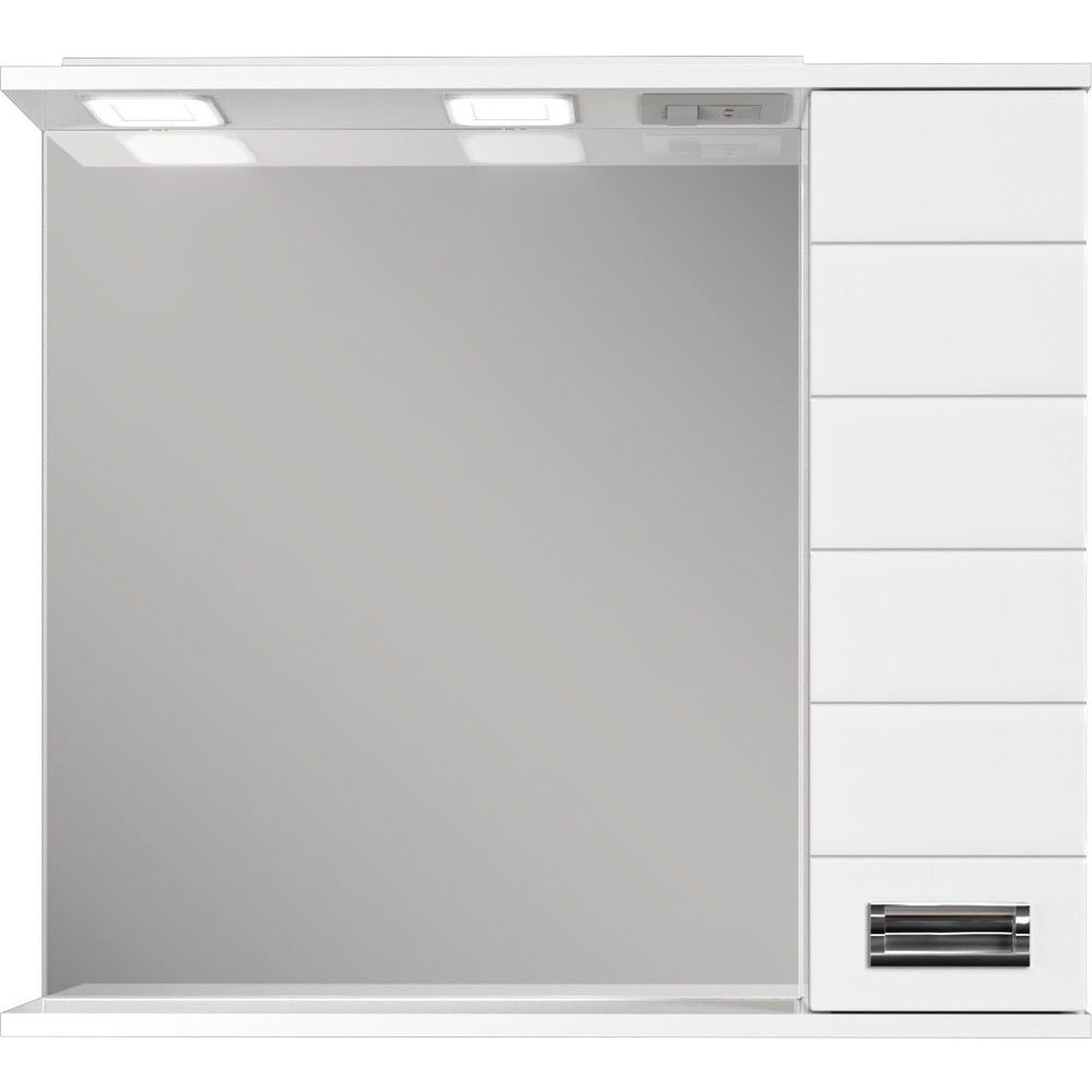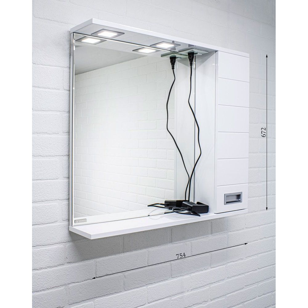 Зеркало имеет размеры 75,4x14,8x70,2 см и выполнено из прочного ЛДСП с эмалевым покрытием, придающим эстетически привлекательный вид. Корпус дополнен хромированной фурнитурой. Удобный электровыключатель с механической кнопкой позволяет легко управлять освещением. Подвесное крепление обеспечивает надежность установки, а механизм доводчика гарантирует бесшумное и плавное закрытие.
