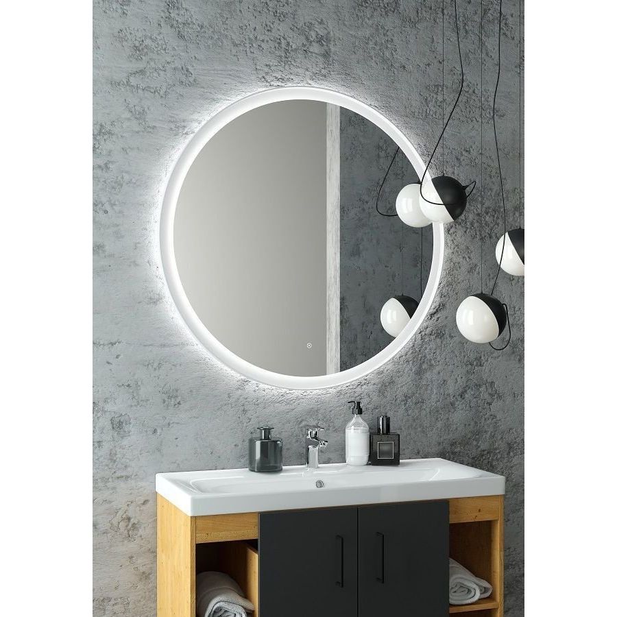 Диаметр зеркала составляет 80 см при глубине всего 3,1 см, что делает его компактным и элегантным решением для любой ванной комнаты. Матовый корпус изготовлен из влагостойкого МДФ и покрыт пленкой soft touch, обеспечивая приятные тактильные ощущения. Питание LED подсветки происходит от сети 220В через блок питания постоянного напряжения. Зеркало оснащено инфракрасным выключателем и регулируемой подсветкой, что превращает его в функциональный элемент интерьера.