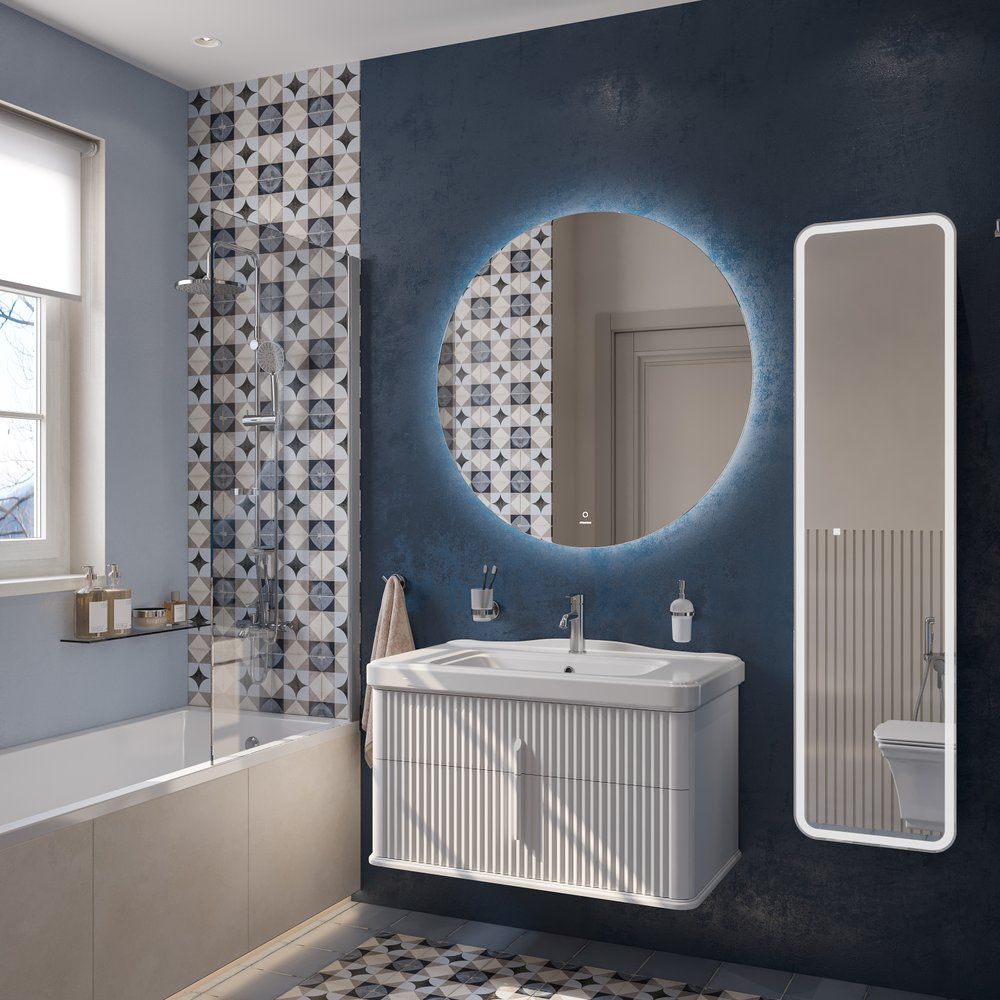 Зеркало имеет габариты 100x2,8x100 см и изготовлено с использованием пластикового корпуса, надежно защищающего электронные компоненты от влаги. Подсветка расположена за полотном и регулируется с помощью сенсорного выключателя, который легко активируется легким касанием. Зеркало подвесное и поставляется с подвесами, позволяющими удобно монтировать его на стену.