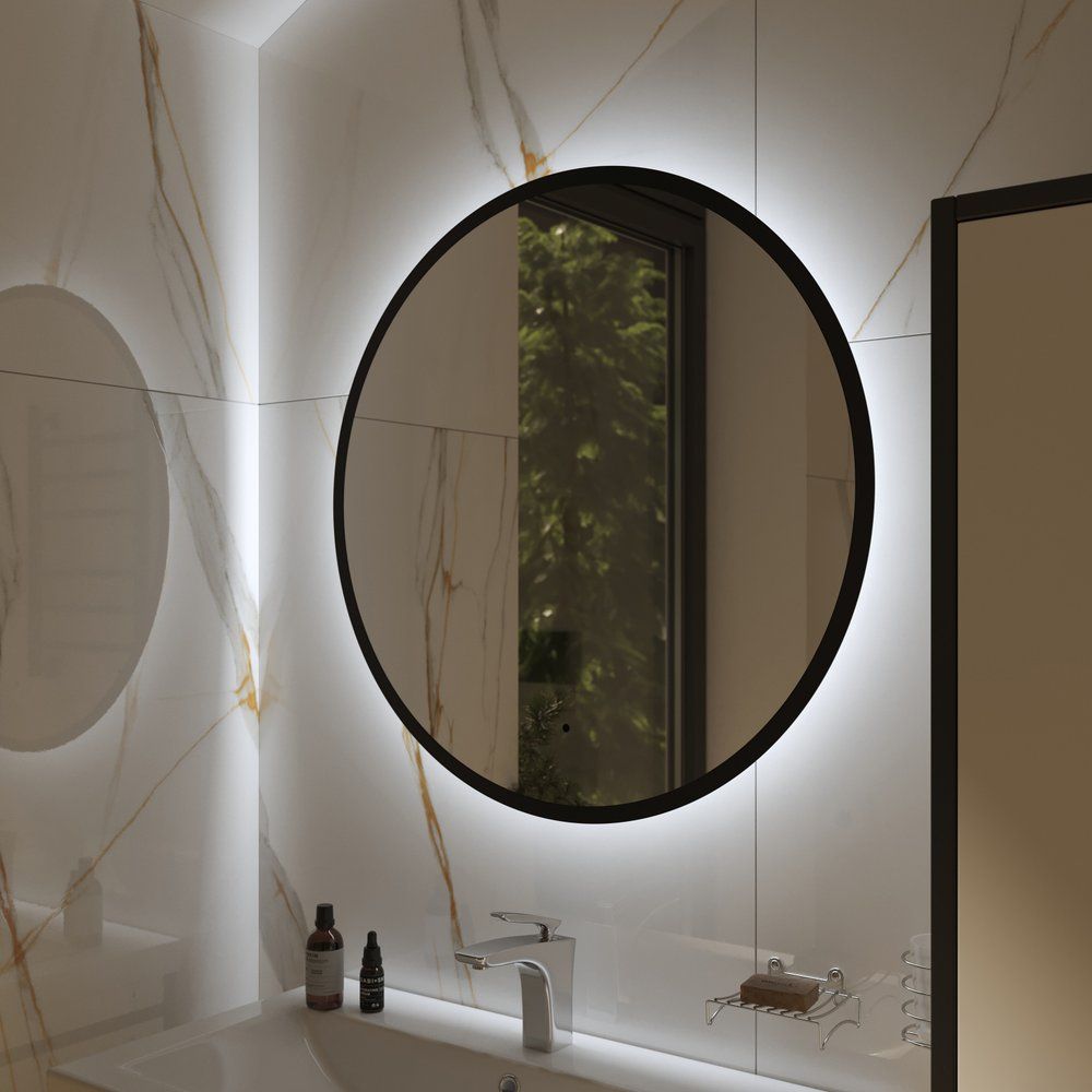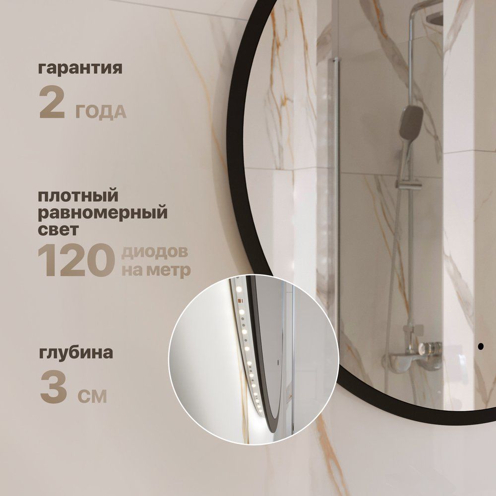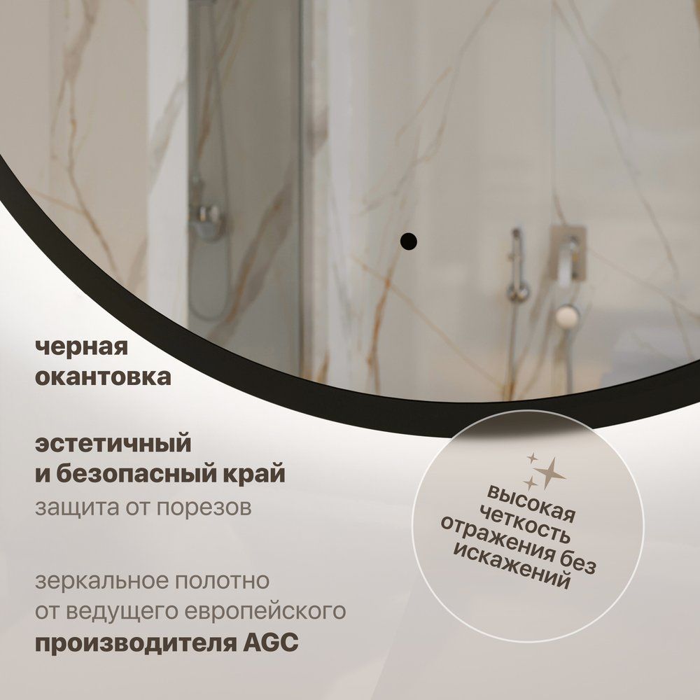 Зеркало идеально круглой формы, диаметр 77 см, с ультратонким обрамлением шириной всего 0,3 см, позволяет зеркалу гармонично дополнять любой интерьер. Встроенная подсветка располагается прямо за зеркальным полотном и управляется с помощью инфракрасного выключателя, что делает использование еще более удобным и современным. Премиум-класс зеркального полотна из Европы гарантирует долговечность и устойчивость.