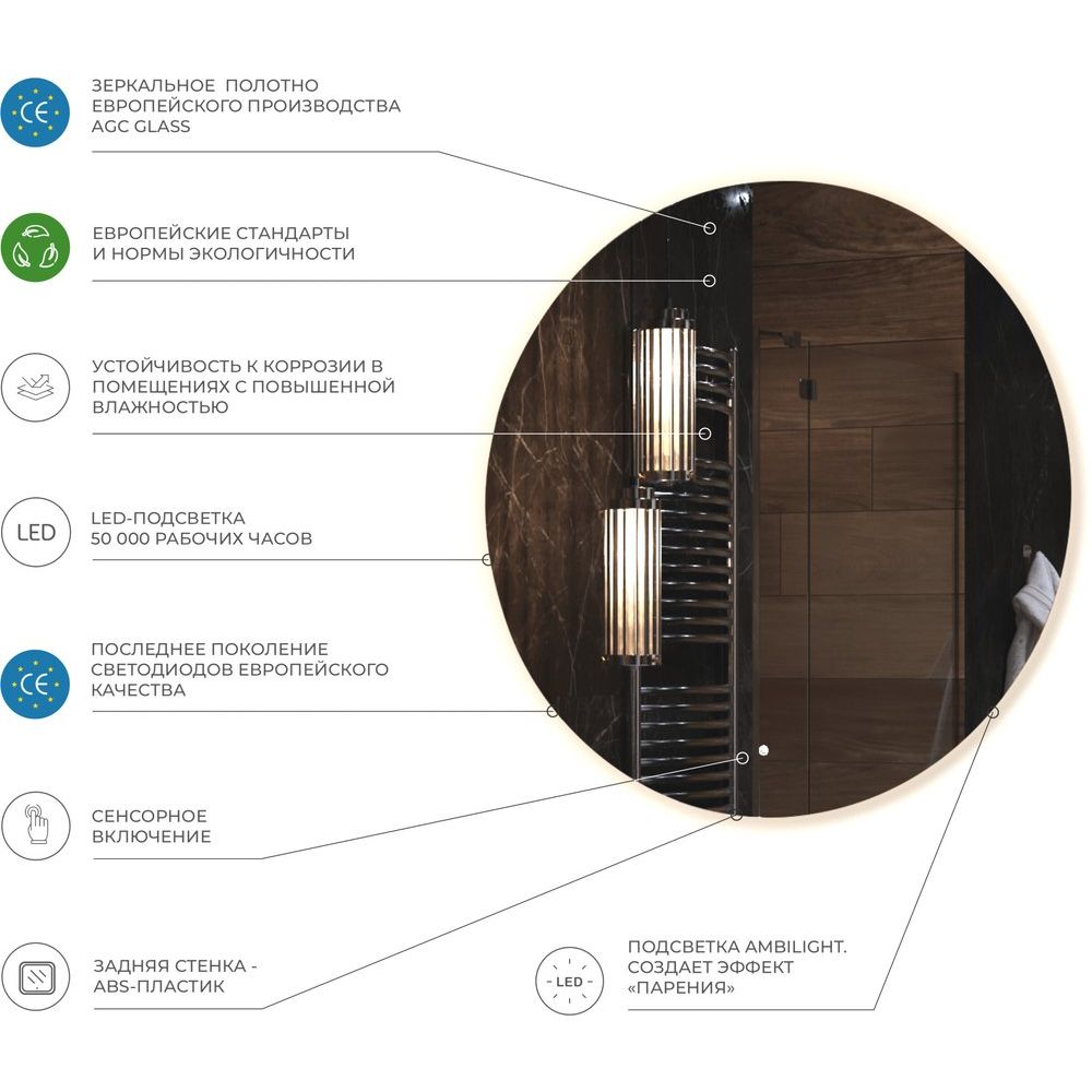 Зеркало имеет габариты 60x3,2x60 см, что делает его идеальным выбором для компактных ванных комнат. Оно изготовлено из высококачественного АБС-пластика, что придает изделию прочность и износостойкость. Подвесная конструкция и дополнительные подвесы обеспечивают легкость установки, а встроенная подсветка с сенсорным управлением выводит его функциональность на новый уровень.