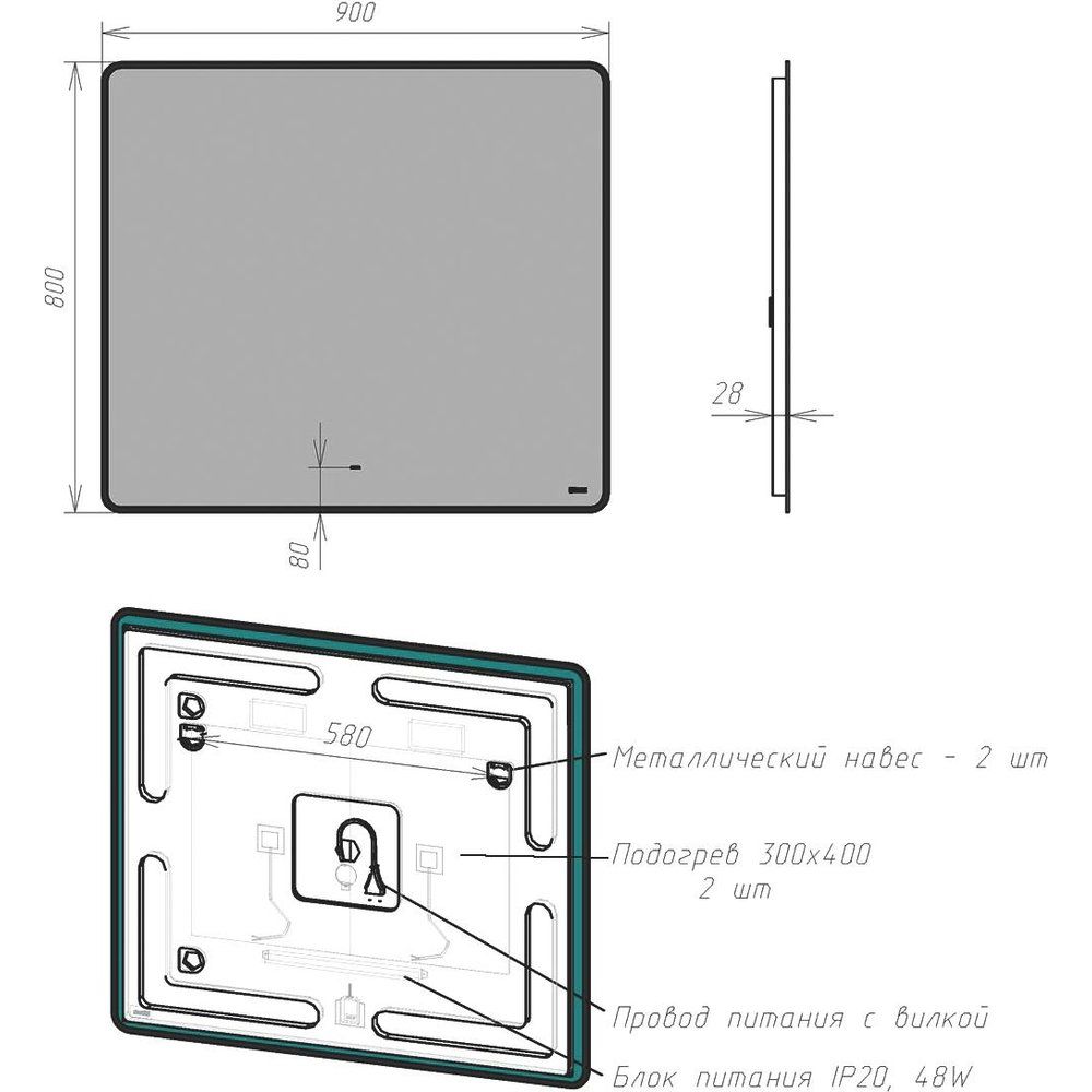 Зеркало имеет размер 90x2,8x80 см и выполнено с корпусом из прочного пластика, что обеспечивает долговечность конструкции. Подсветка за полотном активируется с помощью сенсорного выключателя, который управляется легким касанием сенсорной кнопки. Зеркало также оборудовано функцией обогрева, предотвращающей запотевание. Для простоты монтажа оно оснащено надежными подвесами.