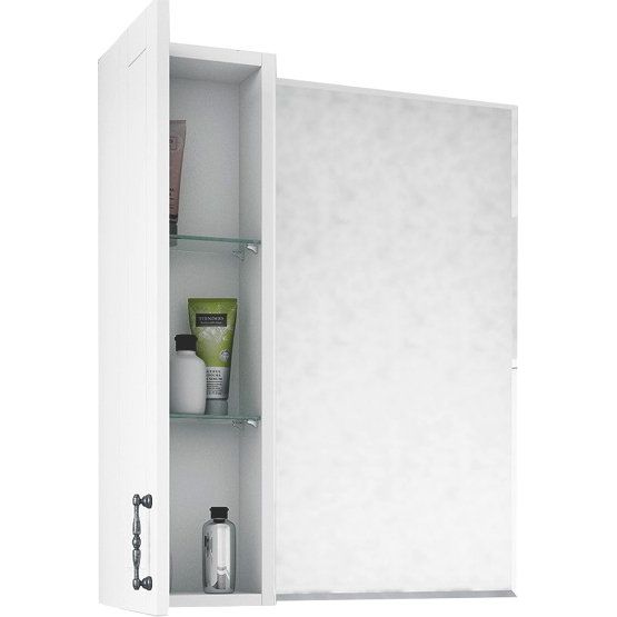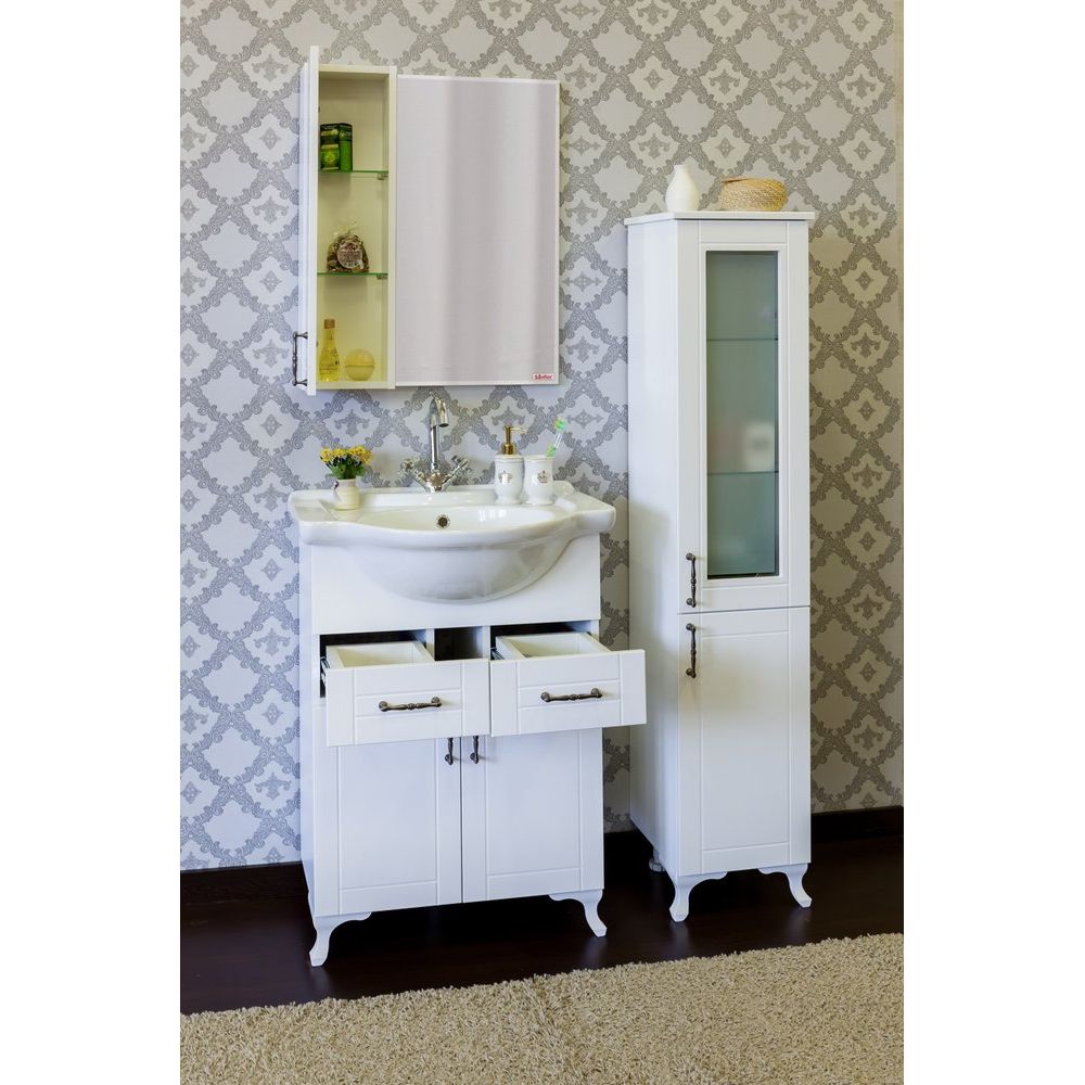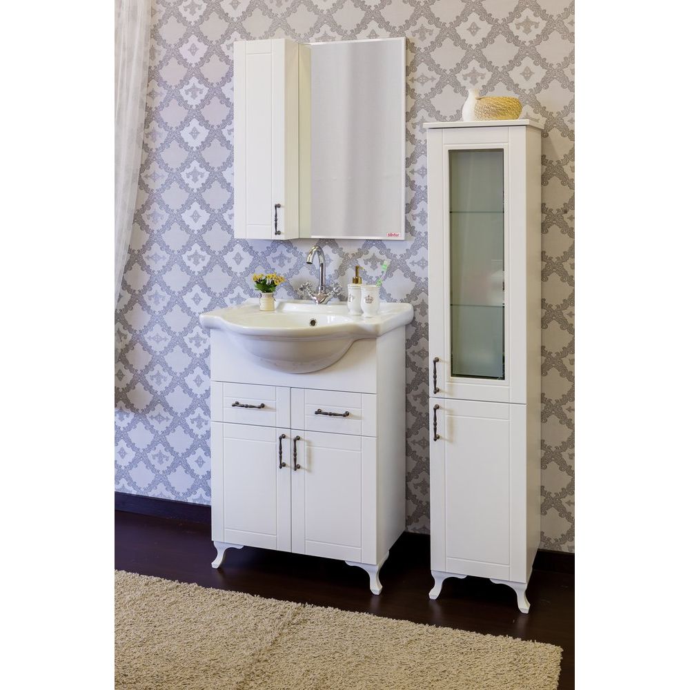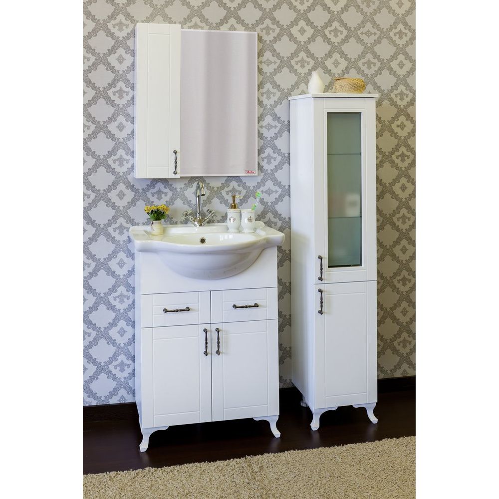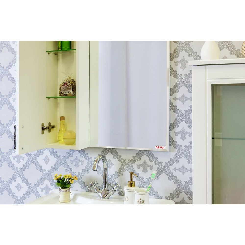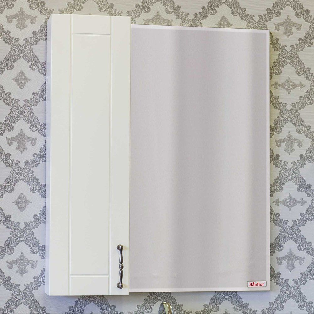 Зеркало Sanflor Глория L, 65 имеет размеры 59,6x14,2x71 см, что делает его удобным вариантом для современных ванных комнат, где важен каждый сантиметр пространства. Корпус изделия изготовлен из надежного ДСП и покрыт защитной эмалью, что придает дополнительную прочность и устойчивость к влаге. Фурнитура с эффектом \"состаренное серебро\" добавляет изысканной нотки в общий дизайн. Встроенный механизм доводчика гарантирует плавное закрывание дверей. Подвесное крепление делает его монтаж простым и удобным. Гарантия на данное изделие составляет 2 года, что подчеркивает его качество и надежность. Производство - Россия.