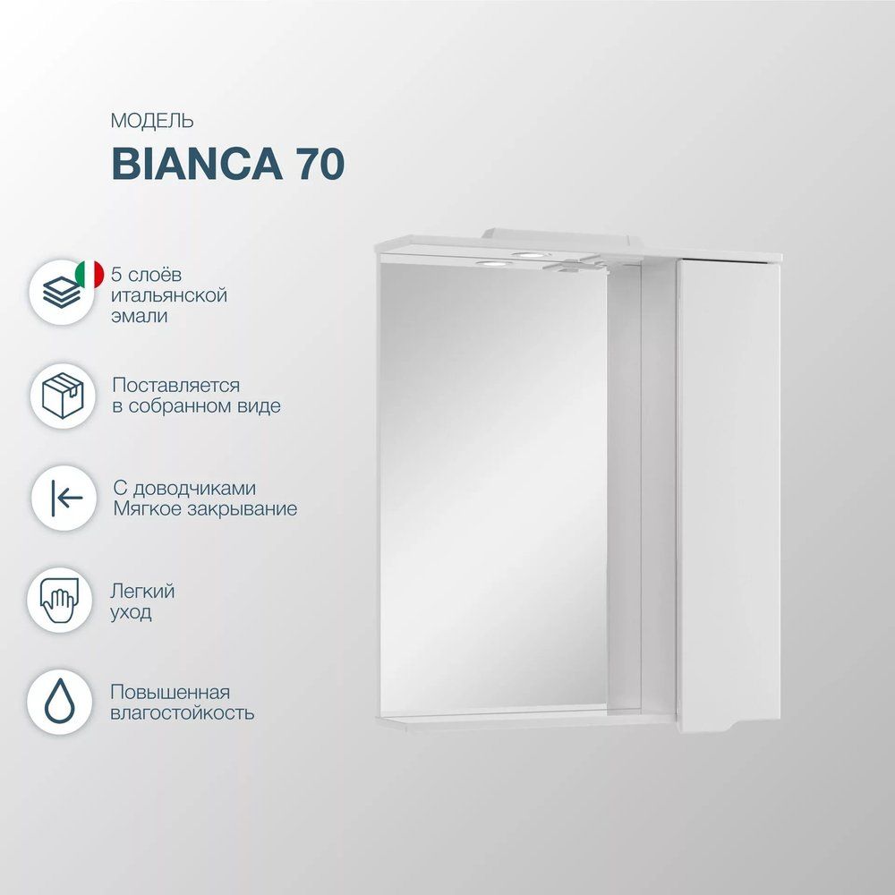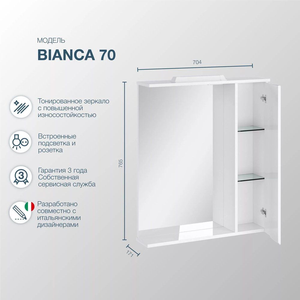 Зеркало SanStar Bianca 70 белое имеет габариты 70,4 см в ширину, 17,1 см в глубину и 84 см в высоту. Изготовлено в России из ламинированных древесно-стружечных плит (ЛДСП) с эмалированным покрытием. Оно оснащено электровыключателем с механической кнопкой и механизмом доводчика, обеспечивающим плавное закрывание. Зеркало также располагает встроенной розеткой и дополнительными подвесами, упрощающими его установку. На изделие распространяется гарантия сроком в 3 года, что подчеркивает его качество и надежность.