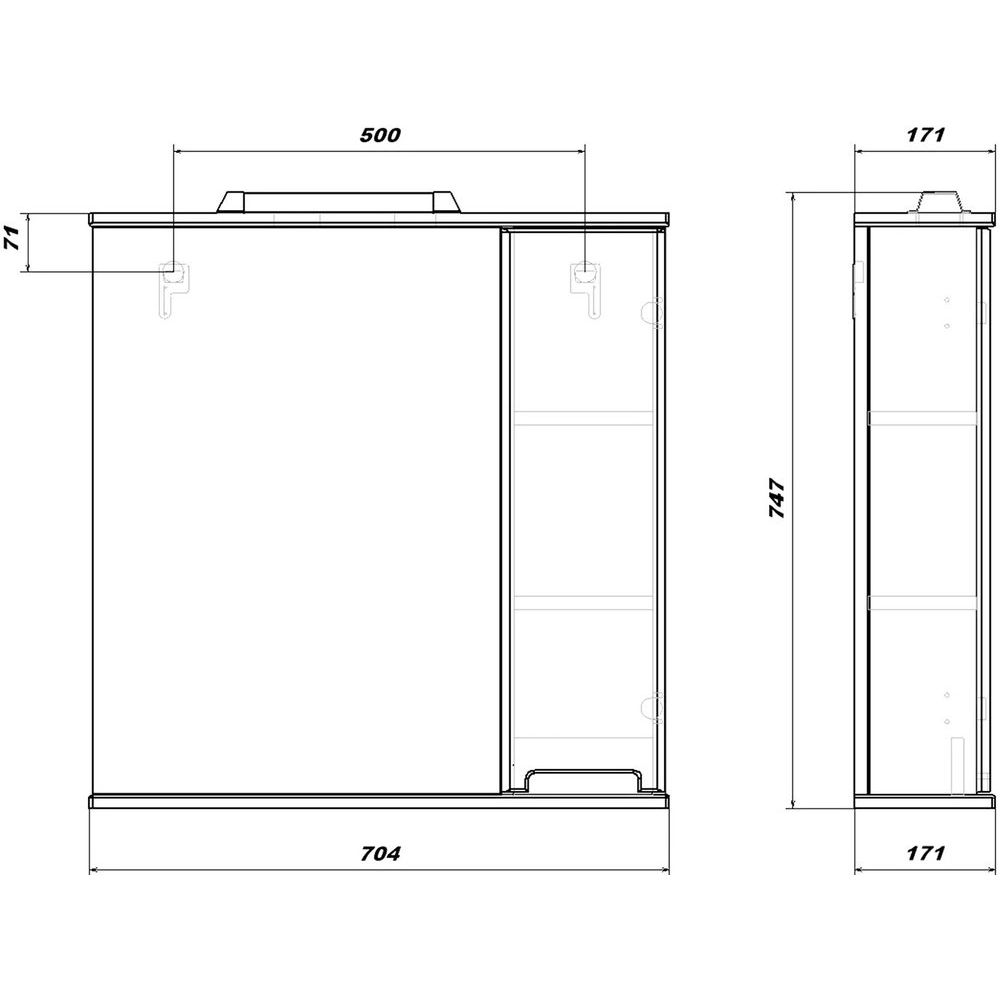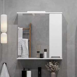 Зеркало с подвесным механизмом имеет размеры 70,4x17,1x74,7 см. Его корпус из ЛДСП покрыт ламинатом, что обеспечивает устойчивость к влаге и механическим повреждениям. Зеркало оборудовано хромированной фурнитурой и электровыключателем. Имеется встроенная розетка для комфортного использования электрических приборов в ванной комнате.