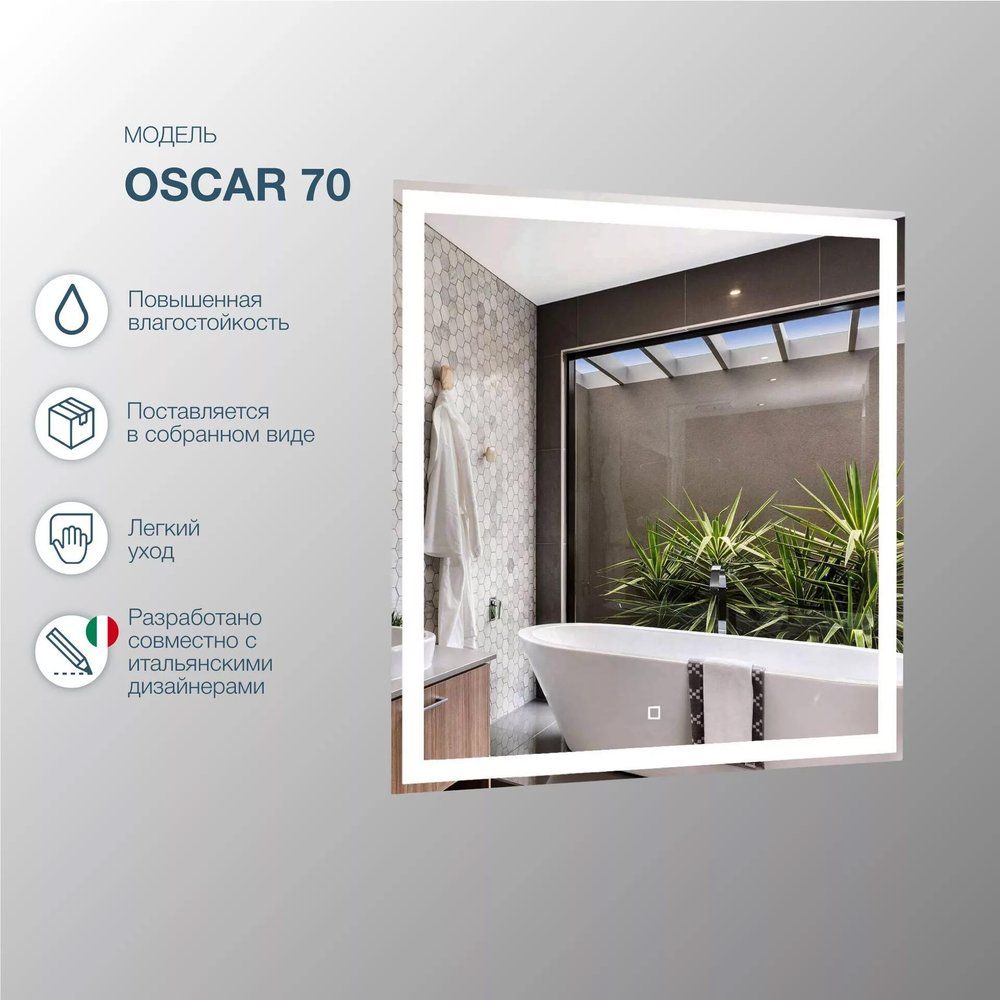 Зеркало SanStar Oscar имеет размеры 70x2,6x80 см и выполнено с корпусом из прочного пластика. Установленная в полотне светодиодная подсветка модели R1, 2835 IP20, содержит 120LED/m, с параметрами 6500К и 9,6Вт/м, и обеспечивает яркость 870Лм/м. Элемент оснащен сенсорным выключателем для легкого управления с помощью касания. Модель также идет с подвесами и предлагает трехлетнюю гарантию. Страна производства — Россия, а сама конструкция — подвесная.