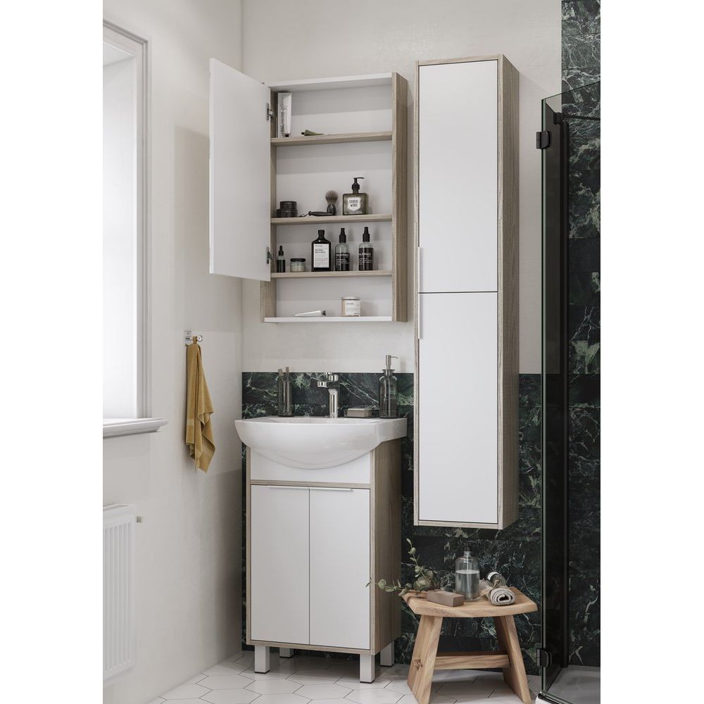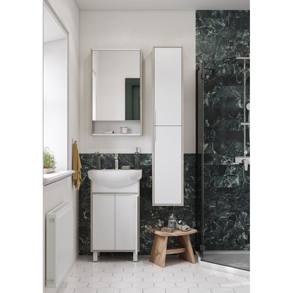 Зеркало-шкаф имеет размер 51x13,5x80 см, что делает его компактным решением для небольших помещений. Корпус выполнен из ЛДСП с эмалированным покрытием, что придаёт изделию дополнительную прочность и легкость в уходе. Отсутствие встроенной подсветки компенсируется продуманной конструкцией, позволяющей легко комбинировать шкаф с имеющимся освещением. Дополнительные подвесы облегчают монтаж и улучшение функциональности.