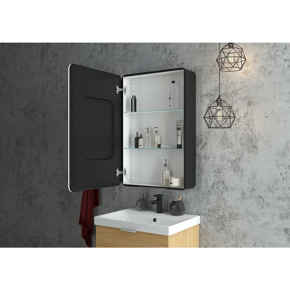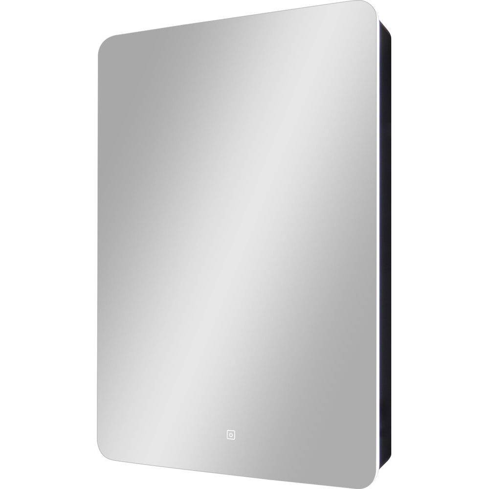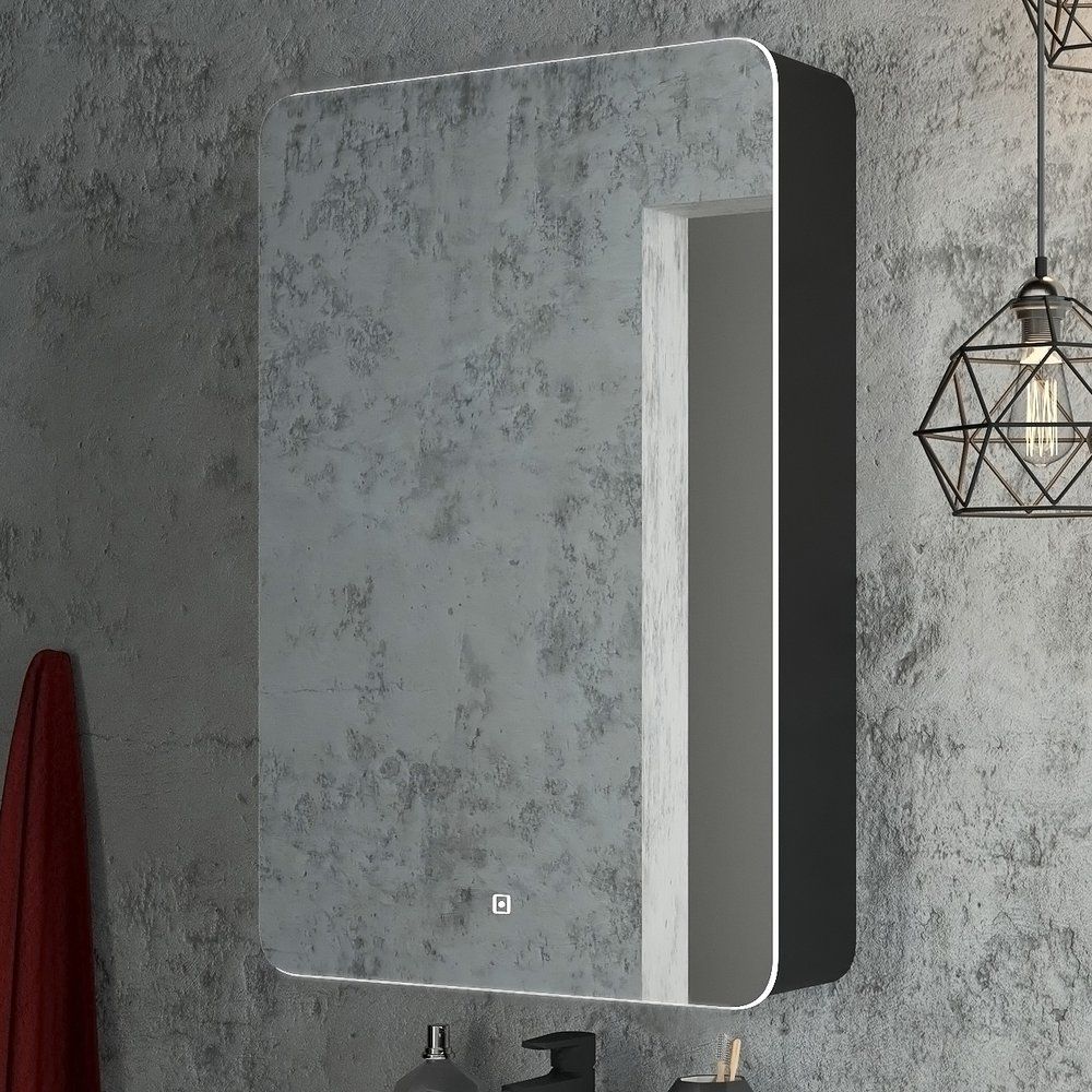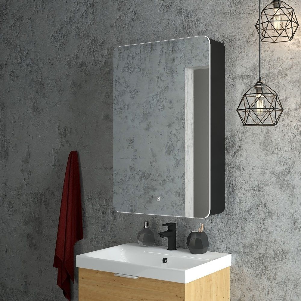 Зеркало-шкаф имеет габариты 56,8x15x85,8 см, что позволяет компактно разместить его в ванной комнате. Корпус выполнен из МДФ и покрыт пленкой с эффектом Soft touch, которая придает изделию стильный облик и защищает от влаги. Зеркало оборудовано регулируемой подсветкой в полотне, управляемой легким касанием сенсорной кнопки, и оснащено механизмом доводчика для плавного закрывания дверей. Встроенная розетка на 220В придаёт дополнительное удобство, а подвесные крепления обеспечивают легкость установки.