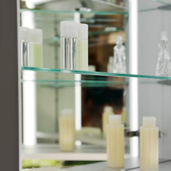 Зеркало-шкаф оснащен сенсорными клавишами для легкого управления освещением, которое можно настраивать от теплого белого до дневного света. Два встроенных гнезда внутри шкафа обеспечивают удобное подключение электрических приборов. Регулируемые по высоте стеклянные полки и наружная полка полной ширины позволяют организовать пространство с максимальным удобством. Светодиоды мощностью 56 Вт с энергосберегающей эффективностью (A++, A+, A) обеспечивают освещение, расходуя 56 кВч на 1000 часов. Использованы качественные фурнитура и доводчики, которые обеспечивают мягкое закрытие дверей. Изделие производится в Германии и имеет гарантию 5 лет, что подтверждает его надежность и качество.