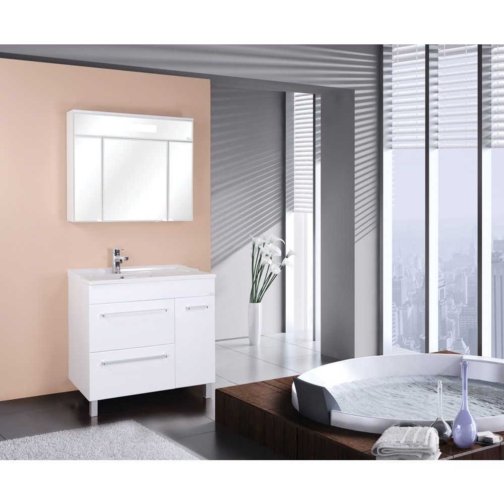 Модель имеет габариты 90x15,4x73,6 см, что позволяет разместить её даже в небольших ванных комнатах. Корпус изготовлен из прочного ДСП, обеспечивая долговечность и устойчивость к влаге. Механическая кнопка для включения подсветки добавляет удобство в использовании. Подвесная конструкция облегчает монтаж и экономит пространство.