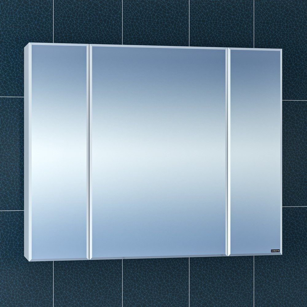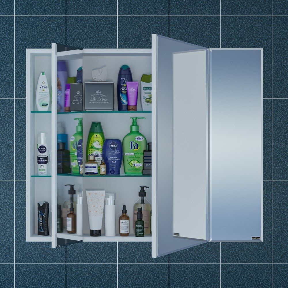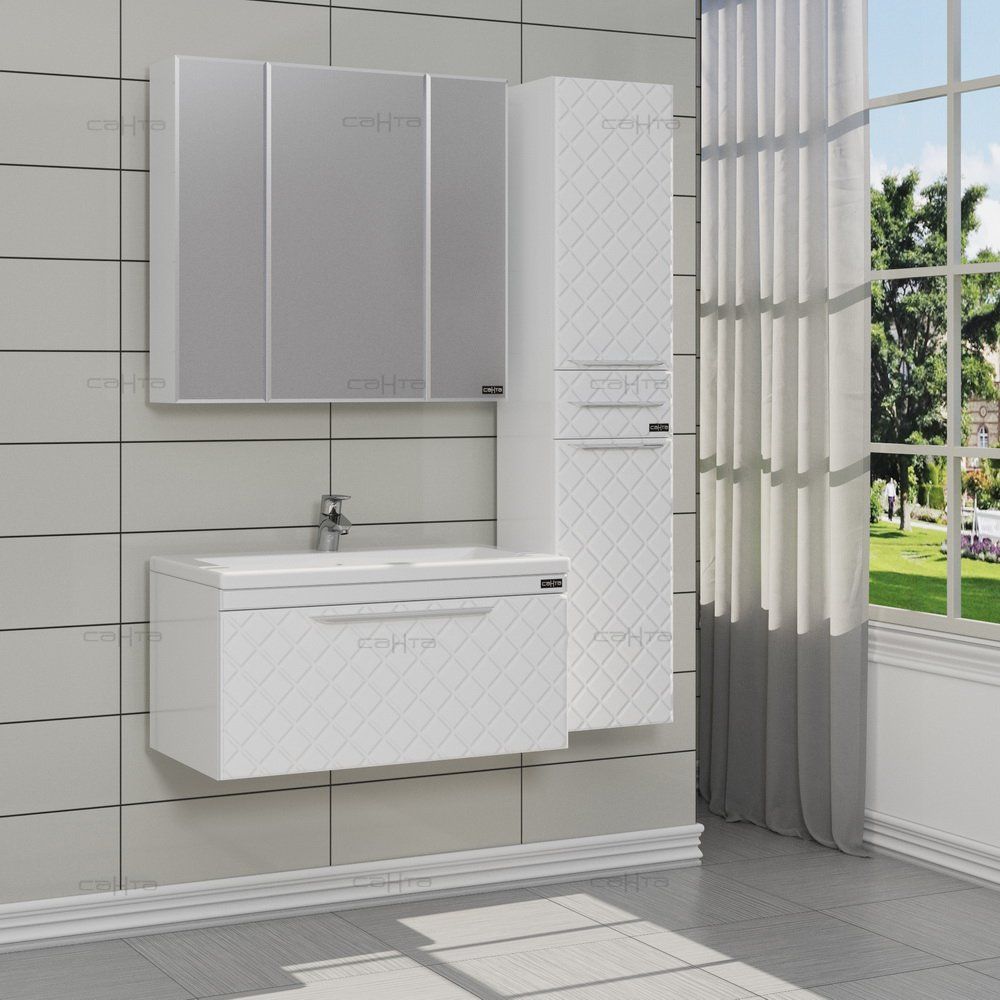Представляем вашему вниманию зеркало-шкаф СаНта Стандарт 90 с фацетом — оптимальное решение для тех, кто ищет функциональность и стиль в интерьере ванной комнаты. Этот настенный шкафчик из коллекции \"Стандарт\" сочетает в себе качество и практичность: фасад покрыт матовой пленкой, защищающей от влаги, а элегантный фацет по периметру придаёт изделию утонченный вид. Удобство использования обеспечено благодаря подвесному способу установки, который также делает шкаф недосягаемым для детей. На удобных полках можно хранить всё необходимое: от маникюрных принадлежностей до косметических средств.