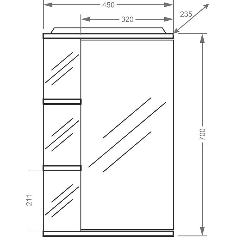 Шкаф-зеркало имеет следующие размеры: ширина 45 см, глубина 23,5 см, высота 70 см. Его корпус выполнен из прочной ЛДСП с ламинатным покрытием. Оснащён удобной механической кнопкой для электрического выключателя и встроенной розеткой. Подвесная конструкция дополнена подвесами для надежного монтажа. Изделие производится в России и продается с гарантией на один год.
