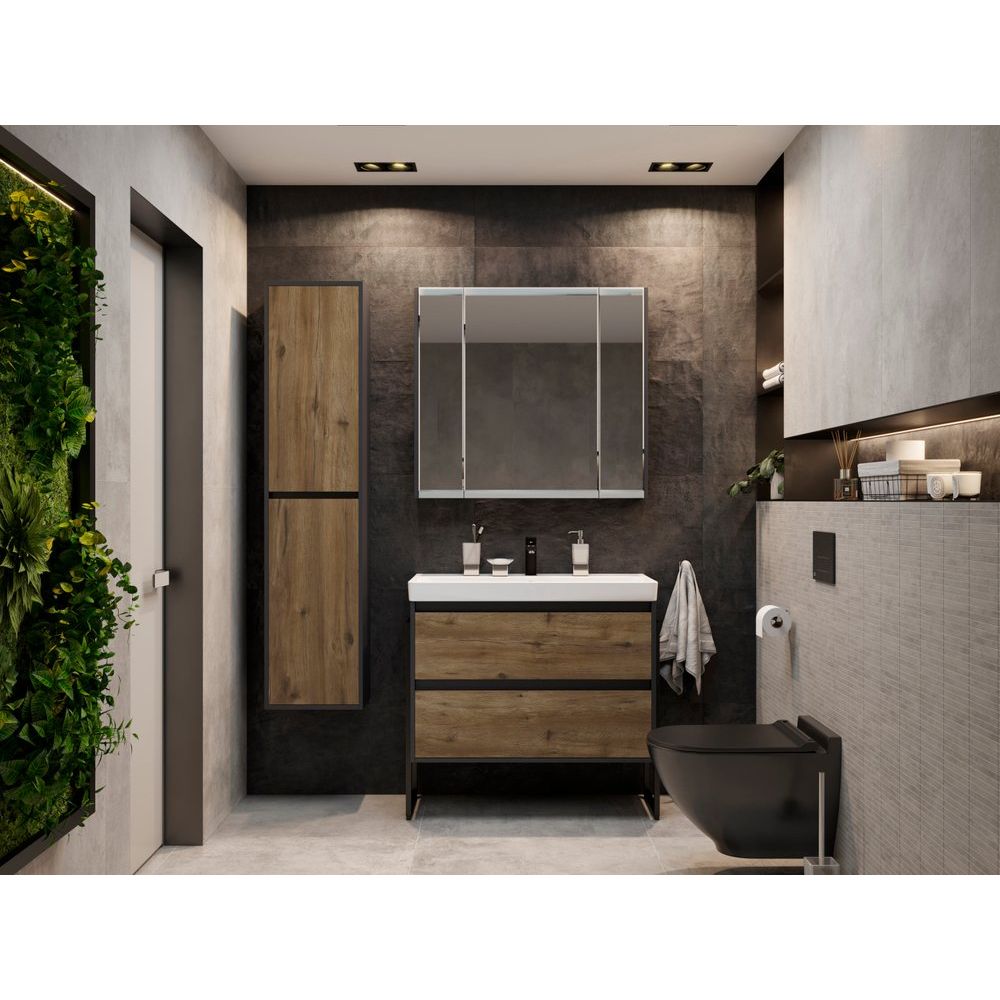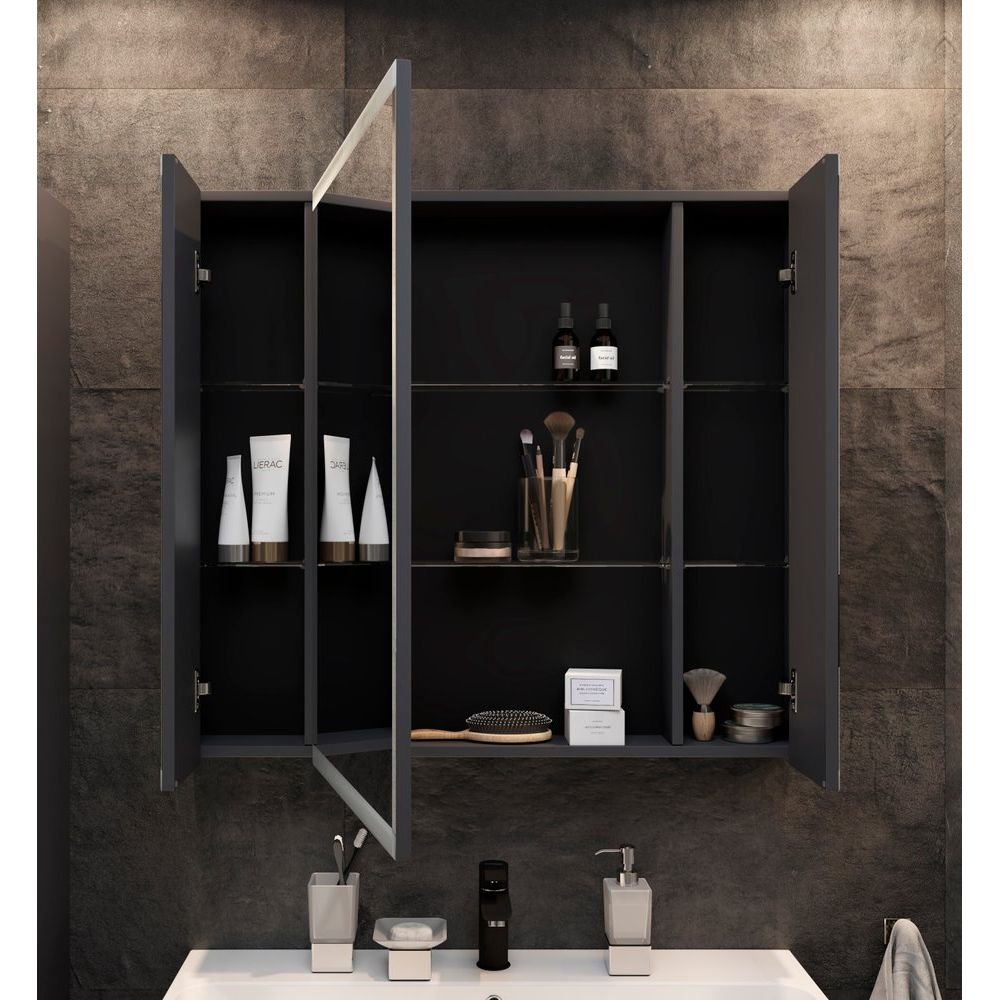 Зеркало-шкаф STWORKI «Кронборг 90» представляет собой идеальное сочетание функциональности и стиля лофт. Это зеркало-шкаф в антрацитовом оттенке добавит вашей ванной комнате атмосферу элегантной брутальности. Исключительное качество отражения позволяет использовать его как для визуального увеличения пространства, так и для повседневного использования. Система хранения скрыта за тремя створками, в которых размещены девять отделений различного размера, что позволяет компактно разместить все ваши необходимые аксессуары. Надежные доводчики обеспечивают плавность и тишину при закрытии дверец. Влагостойкий корпус из ламинированного ДСП с металлическими подвесами гарантирует долгий срок службы и легкость монтажа.