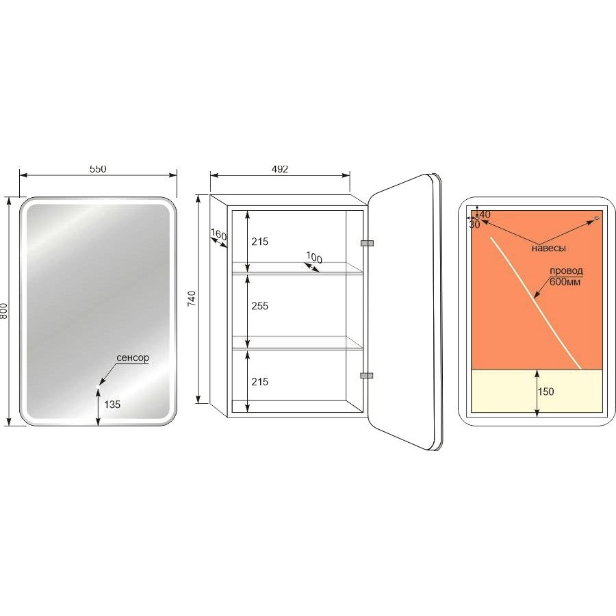 Зеркало-шкаф имеет компактные размеры 55x16x80 см, идеально подходящие для небольших ванных комнат. Корпус выполнен из устойчивого к влаге МДФ материала и покрыт защитной пленкой, что обеспечивает долговечность и простоту ухода. Встроенная подсветка включается и выключается легким касанием сенсорной кнопки, предлагая комфорт и экономию энергии. Дополнительно зеркало оснащено подвесами, что облегчает его установку. На изделие предоставляется 5-летняя гарантия, подтверждающая качество продукции.