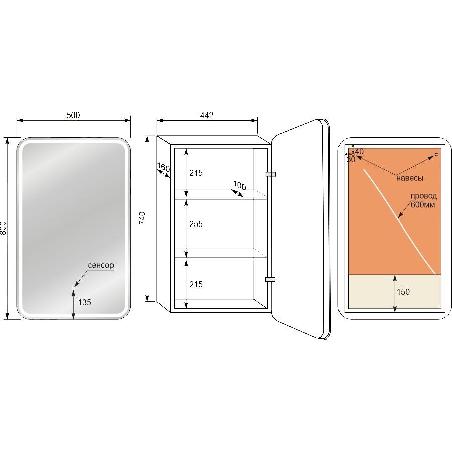 Зеркало-шкаф имеет размеры 50x16x80 см, что делает его идеальным для небольших и средних ванных комнат. Корпус выполнен из прочного МДФ и покрыт пленкой для дополнительной защиты от влаги. Встроенная подсветка позволяет пользователям комфортно использовать зеркало даже в условиях недостаточной освещенности. Сенсорный выключатель облегчит эксплуатацию — управление производится легким касанием. Зеркальная поверхность дополнительно укомплектована подвесами для удобного монтажа. Товар имеет гарантию один год и произведен в России.