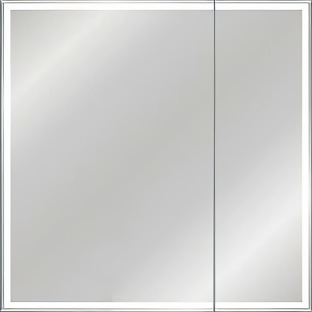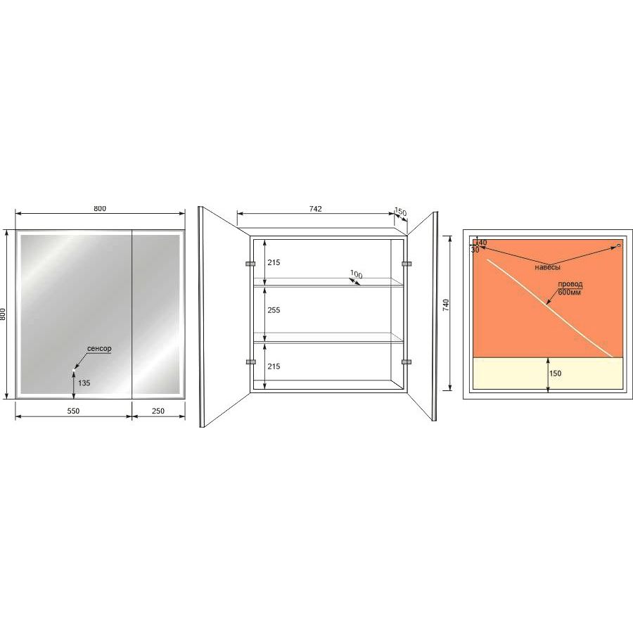 Зеркало-шкаф имеет габариты 80x16x80 см и изготовлено из прочного МДФ, покрытого водостойкой пленкой. У совмещённого с зеркалом шкафа встроена подсветка с удобным инфракрасным выключателем. Для удобства монтажа предусмотрены подвесы. Производитель — Россия.