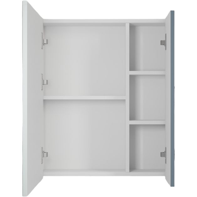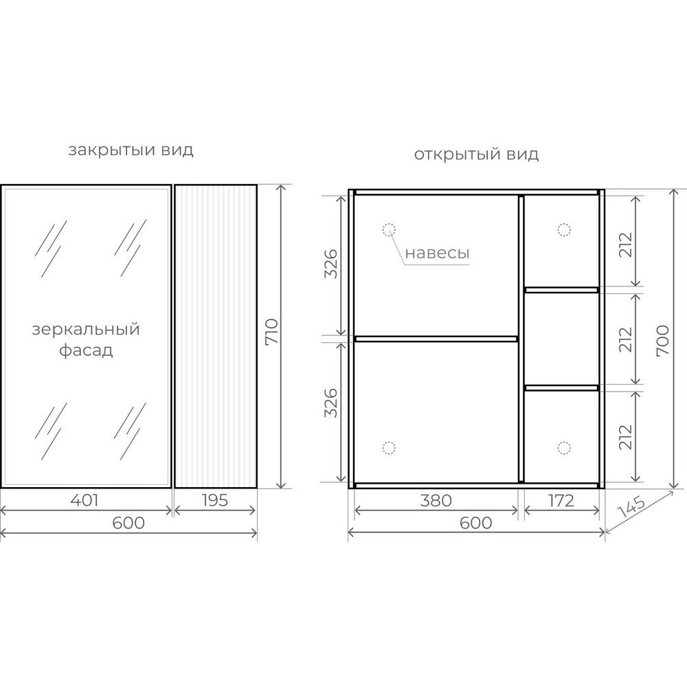 Зеркало-шкаф имеет размеры 60 см в ширину, 14,5 см в глубину и 71 см в высоту. В основе корпуса — прочный МДФ с эмалированным покрытием, которое обеспечивает дополнительную защиту от влажности. Отсутствие подсветки делает его идеальным для помещений с уже установленными источниками света. Все элементы надежно закреплены подвесами, что упрощает установку.