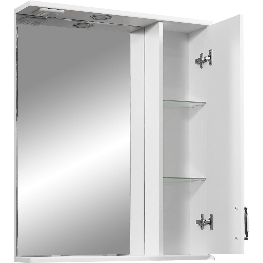 Зеркало имеет размеры 65x14,5x80 см и выполнено из ламинированного ЛДСП в цвете \"ольха белая\". Удобство использования обеспечивают встроенная розетка и механическая кнопка электровыключателя. Фурнитура выполнена в бронзе, а доводчик гарантирует плавность закрывания. Зеркало подвесное и оснащено подвесами. На изделие предоставляется гарантия 1 год.