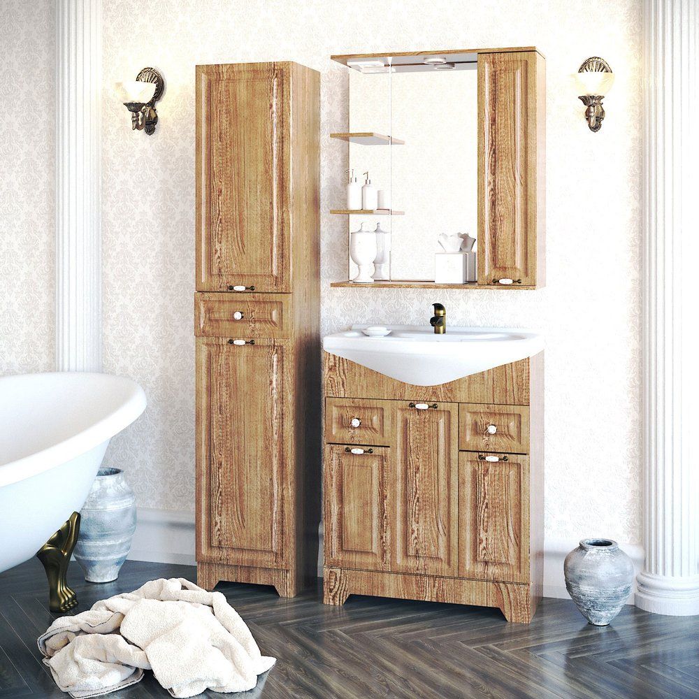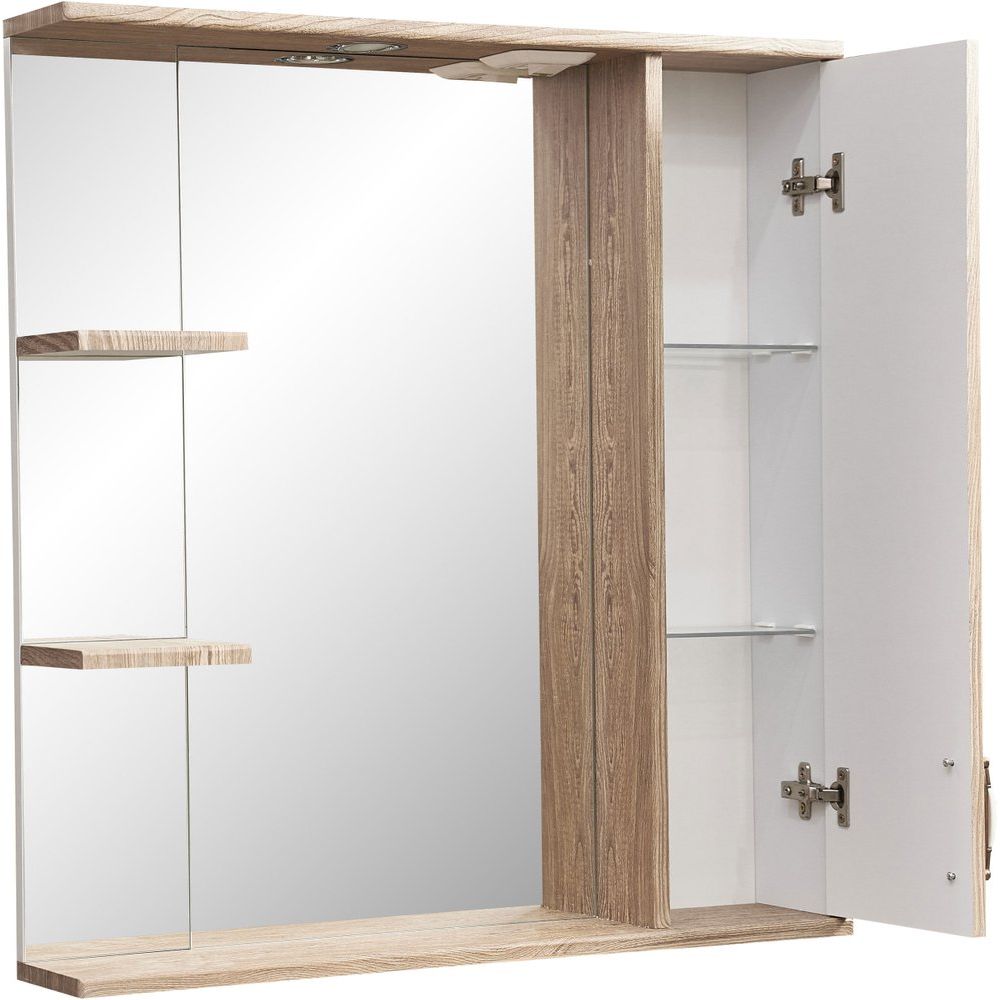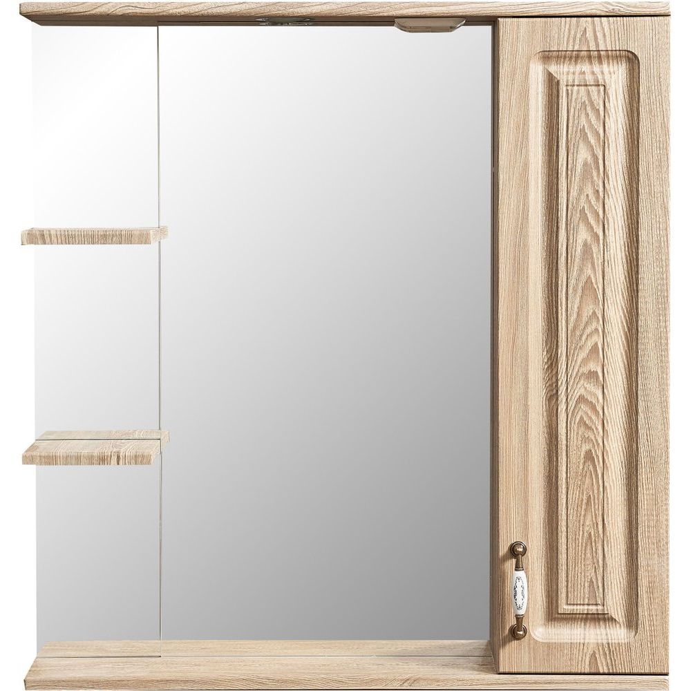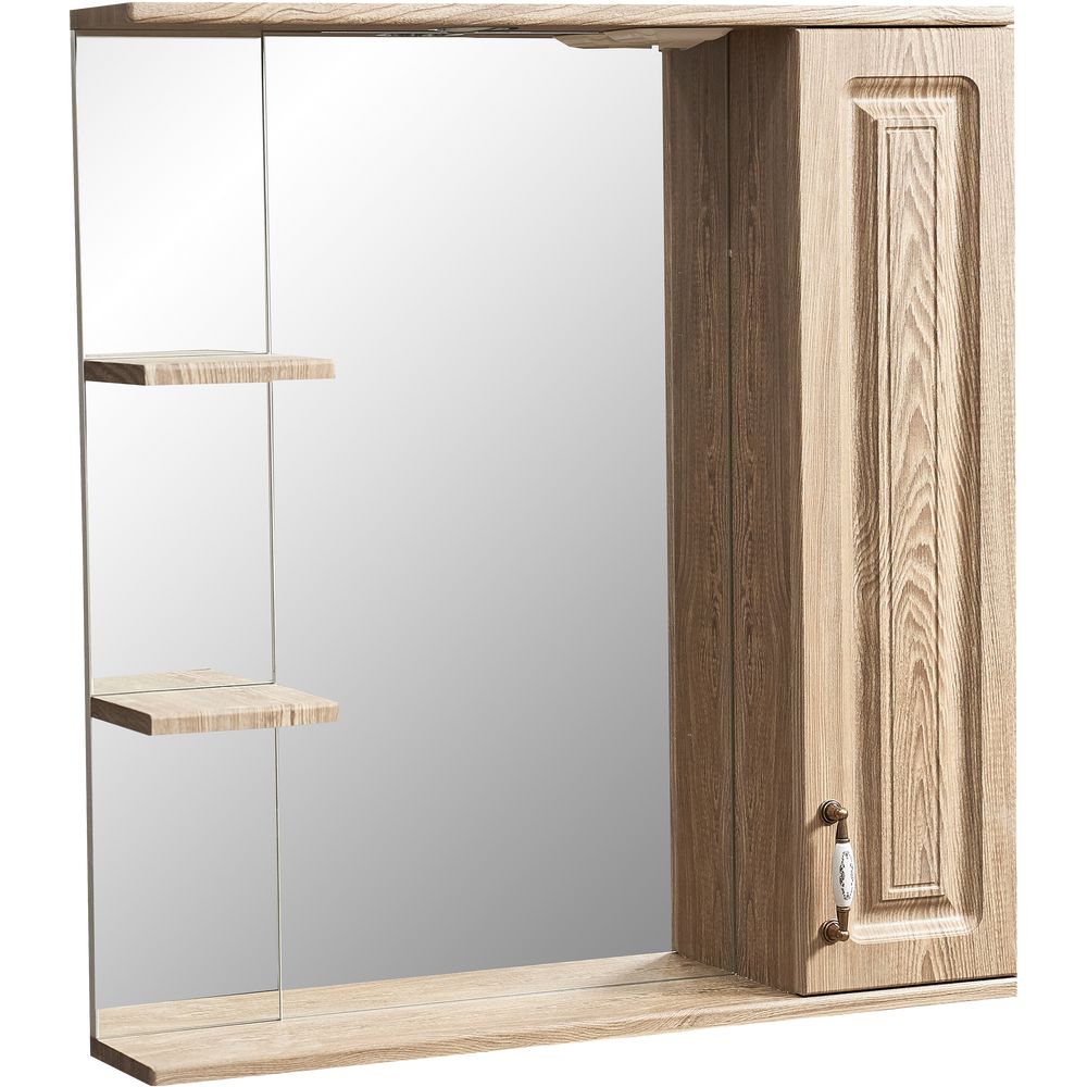 Зеркало имеет размеры 75 х 14 х 80 см и выполнено из высококачественного МДФ, покрытого пленкой для долговечности и устойчивости к влаге, что особенно важно в ванной комнате. Механическая кнопка выключателя добавляет удобства в использовании. Бронзовая фурнитура подчеркивает утончённость изделия. Оснащено дополнительными подвесами для надежной фиксации и включает встроенную розетку для удобства подключения электроприборов.