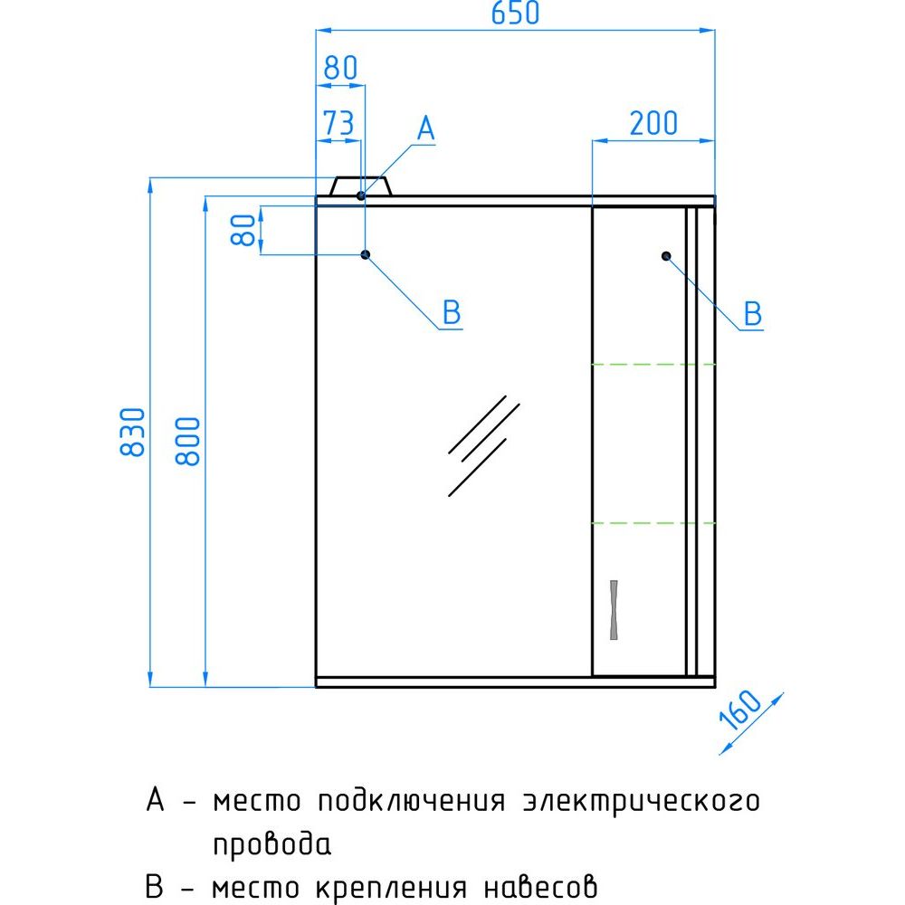 Зеркало-шкаф имеет размеры 65x16x83 см, что делает его подходящим для небольших ванных комнат. Корпус выполнен из ДСП с ламинированным покрытием, обеспечивающим долговечность конструкции. Модель оснащена механическим электровыключателем и розеткой для вашего удобства. В комплектацию также входят подвесы для крепления. Зеркало поставляется с гарантией на 1 год и произведено в России.