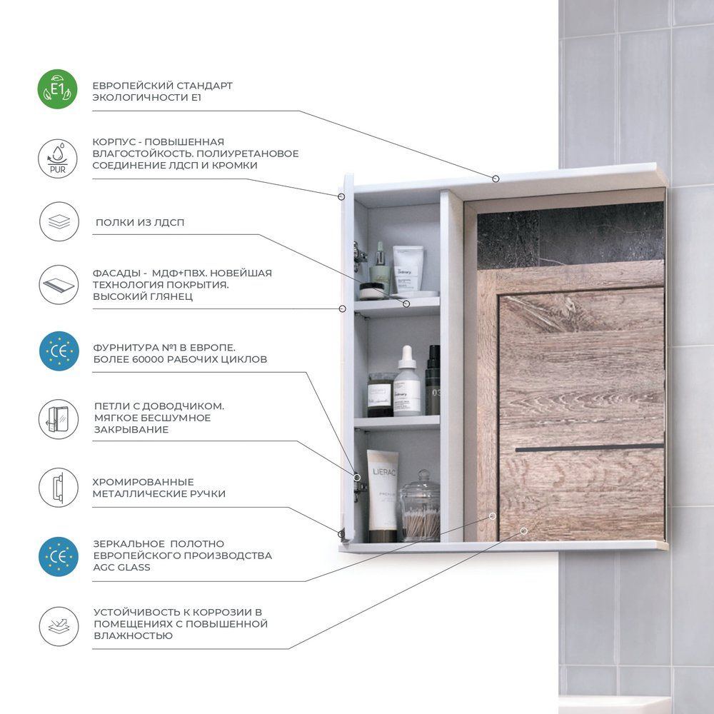 Зеркало Vigo Callao R 60 имеет размеры 60,5 см в ширину, 15,6 см в глубину и 70 см в высоту, что делает его оптимальным для ванных комнат среднего размера. Корпус выполнен из ламинированного ЛДСП, что обеспечивает долговечность и устойчивость к влажной среде. Хромированная фурнитура придаёт изделию современный вид. Механизм доводчика обеспечивает плавное и бесшумное закрывание, а подвесы облегчают установку. Изделие производится в России и комплектуется гарантией на 2 года.