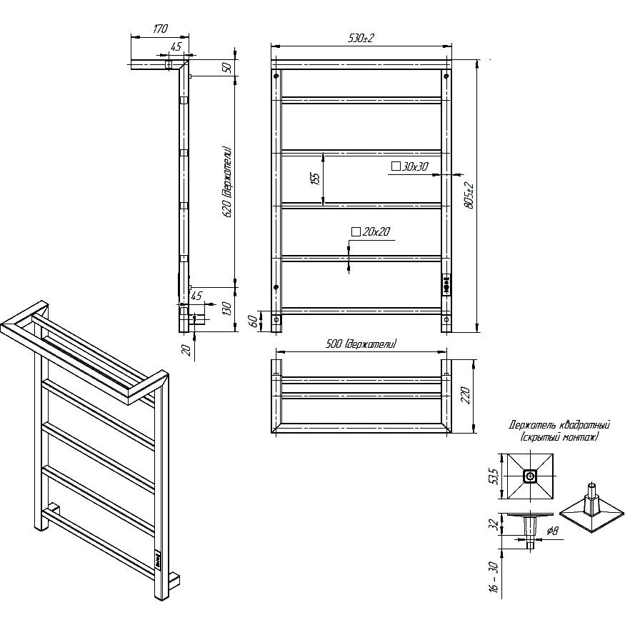 Полотенцесушитель Altasan СкалаПроф имеет размеры 53x80,5 см, выполнен из прочной стали с электросварным швом. Потребляемая мощность составляет 105 Вт, что обеспечивает быстрый нагрев. Встроенный терморегулятор позволяет выбрать комфортную температуру, а наличие таймера делает эксплуатацию изделия ещё более удобной. Модель оснащена полкой для дополнительного удобства, а подвесная конструкция облегчает монтаж. Подключение к сети возможно как через кабель с вилкой, так и скрыто в стене.
