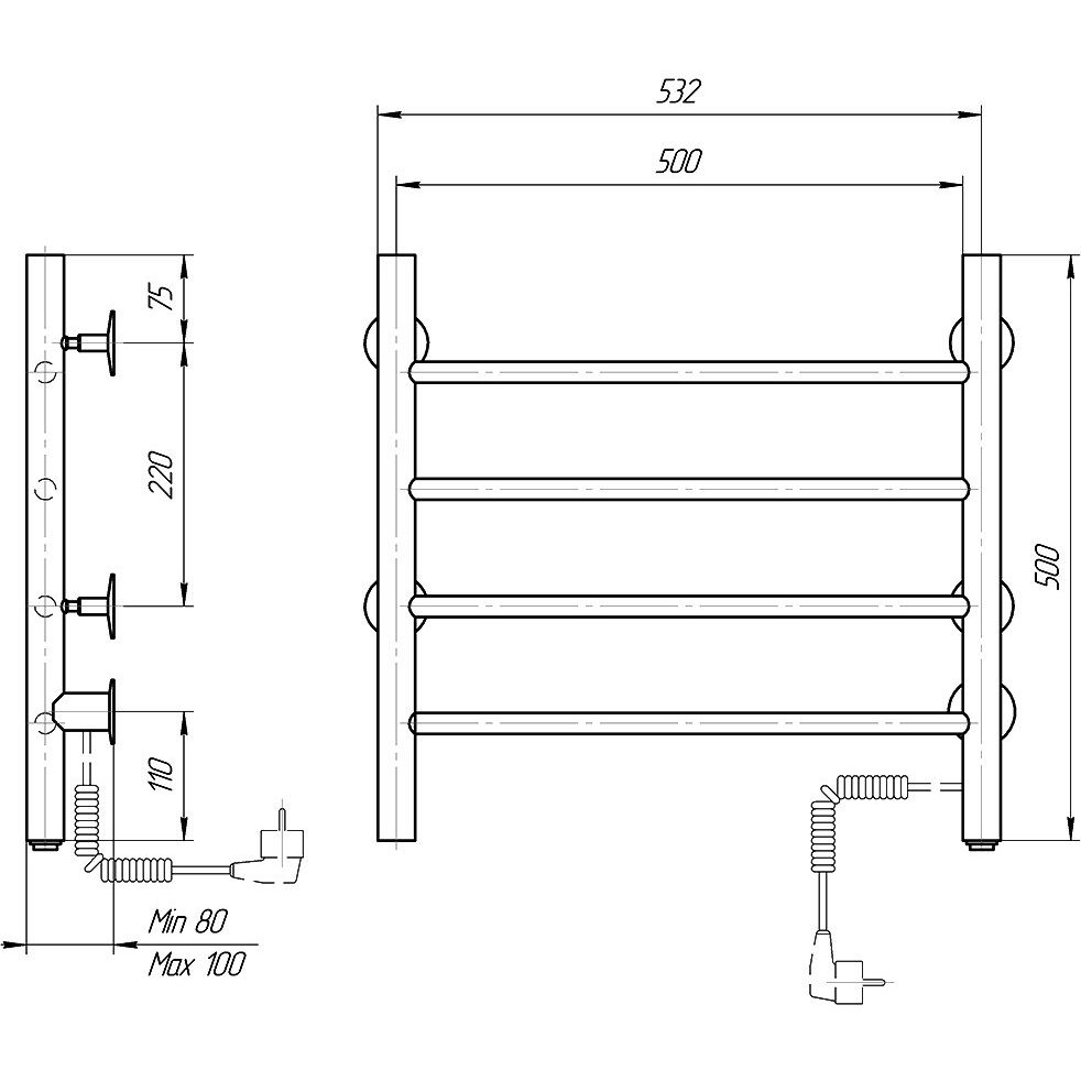Полотенцесушитель Domoterm Классик DMT 109-4 имеет вертикальные стойки диаметром 32 мм и горизонтальные перекладины из трубы диаметром 18 мм, что обеспечивает прочность конструкции. Устройство подключается к электрической сети через кабель с вилкой или может быть скрыто в стене, в зависимости от ваших предпочтений и возможностей помещения. Его мощность составляет 53 Вт, что достаточно для обогрева площади до 0.52 м². Сушка полотенец осуществляется сухим образом с помощью нагревательного кабеля, встроенного внутрь. Полотенцесушитель выполнен из электросварной трубы из нержавеющей стали и предназначен для подвесного крепления.