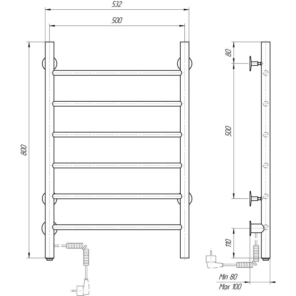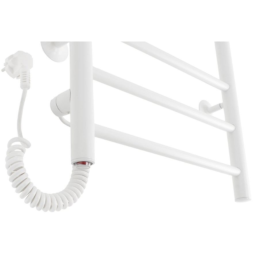 Полотенцесушитель имеет размеры 53,2 х 80 см и мощность 72 Вт, что позволяет эффективно обогревать площадь 0.72 м². Он подключается к электрической сети через кабель с вилкой или может быть подключен скрыто в стене для более аккуратного вида. Модель оснащена нагревательным кабелем сухого типа и системой управления на корпусе, которая обеспечивает удобное отключение электропитания. Левостороннее подключение дает гибкость при установке в различных вариантах помещений, а материал из нержавеющей стали и качественный электросварной шов обеспечивают стойкость к коррозии.