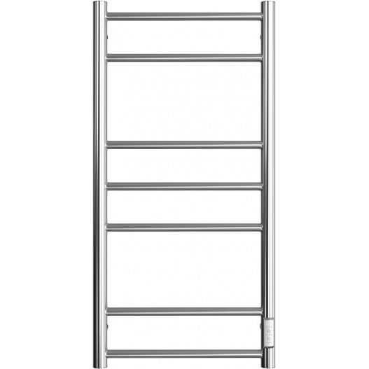 Полотенцесушитель имеет размеры 43x80 см, что делает его компактным решением для ванных комнат. Подключение к электросети возможно через кабель с вилкой или скрыто в стене. Для удобства на корпусе имеется переключатель питания и световой индикатор. Встроенный терморегулятор и таймер обеспечивают экономичное использование, а нагревательный кабель внутри прибора гарантирует равномерное распределение тепла. Устройство подвесного типа, комплектуется креплениями, что облегчает установку. Изготовлено из нержавеющей стали.