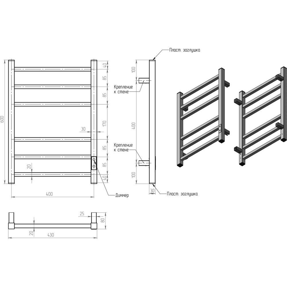 Габариты полотенцесушителя составляют 43 см в ширину и 60 см в высоту, что делает его компактным, но достаточно мощным прибором с мощностью 134 Вт, способным обогреть площадь до 3.2 м2. Питание осуществляется через кабель с вилкой либо скрытое подключение к электрической сети внутри стены. В корпусе предусмотрен световой индикатор и выключатель. Для безопасности предусмотрена функция автоотключения при нагреве.