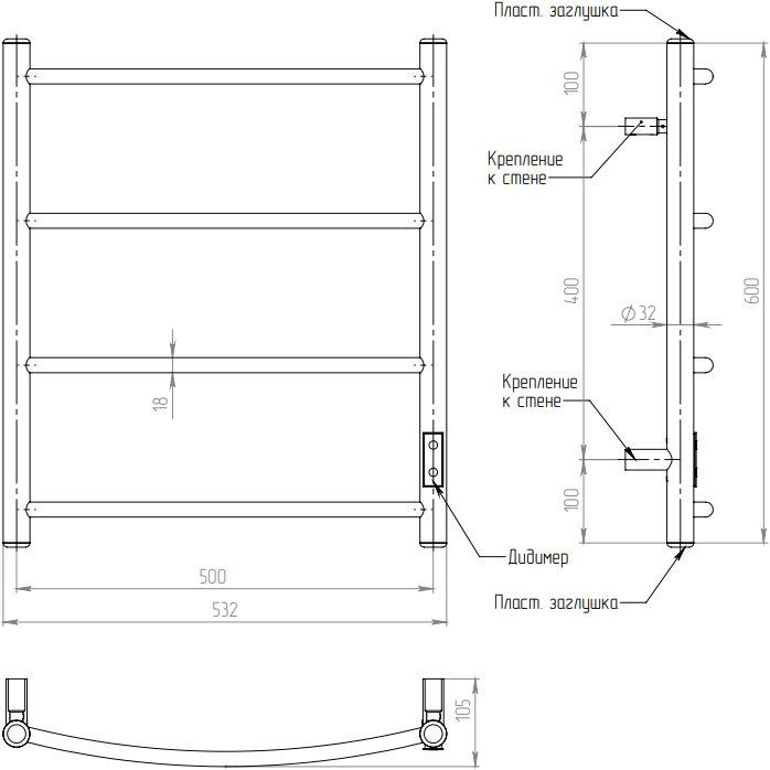 Полотенцесушитель EWRIKA Деметра Д R 60×50 предназначен для подвесного монтажа и выполнен из прочной стали с электросварным швом. Размеры изделия составляют 53,2x60 см, что оптимально для рационального использования пространства. Подключение к электрической сети можно осуществить как через кабель с вилкой, так и скрытым способом в стене, а расположение подключения возможно как справа, так и слева. Нагревательный элемент (ТЭН) находится внизу, обеспечивая равномерный обогрев площади до 2.1 м2. В комплектацию входят крепления и электрический кабель. Производство - Россия, гарантия действует 2 года.