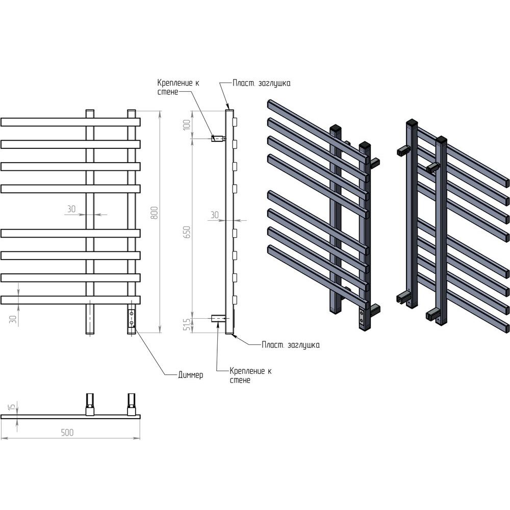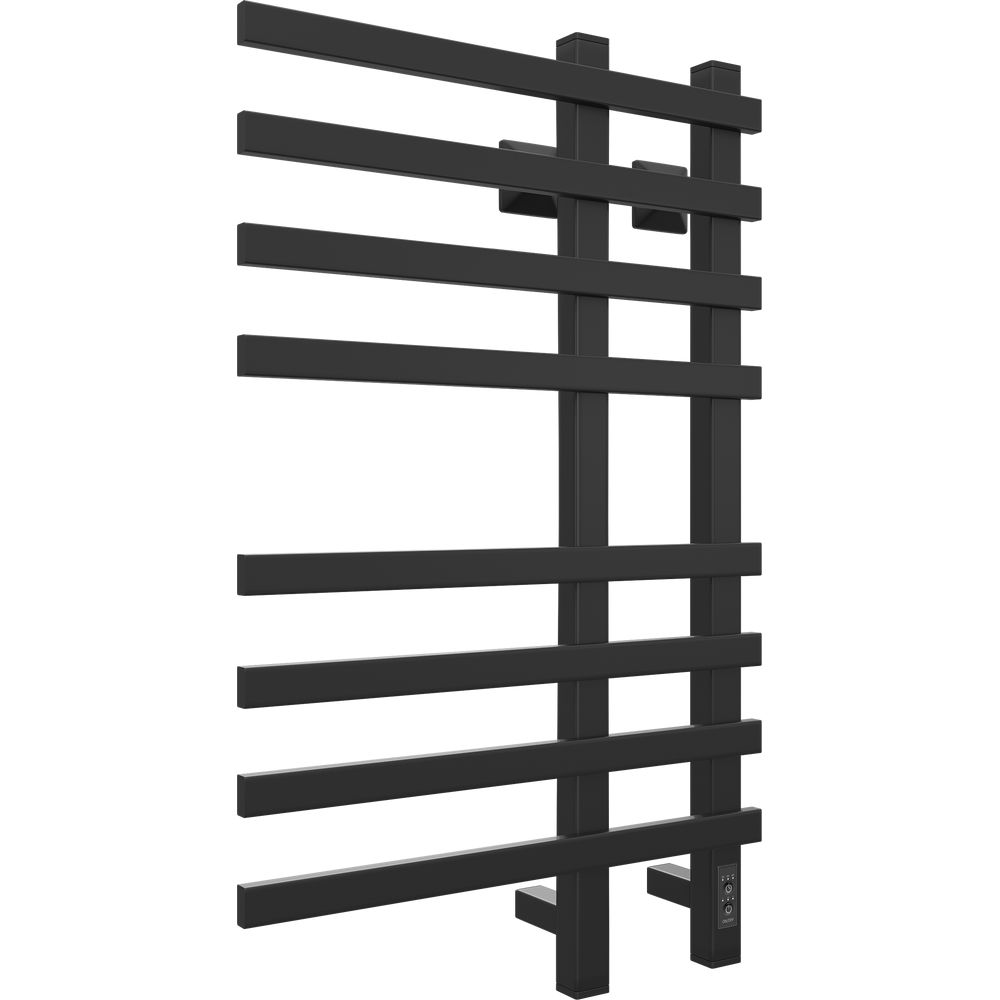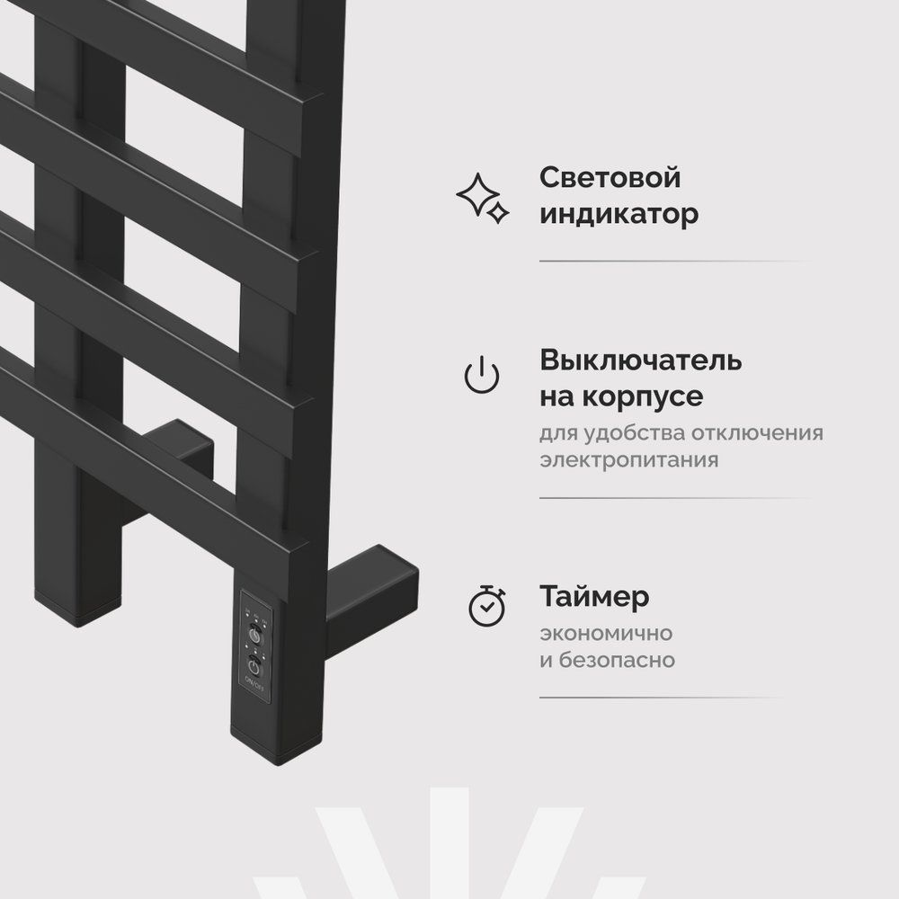 Электрический полотенцесушитель EWRIKA Медея LT 80х50 в стильном черном исполнении — идеальное сочетание современного дизайна и функциональности. Он не только поможет поддерживать комфортную температуру в ванной комнате, но и позаботится о сухости и теплоте ваших полотенец. Установленный на корпусе блок управления с двумя кнопками облегчает использование, позволяя легко включать, выключать прибор и задавать таймер на период от 2 до 6 часов.