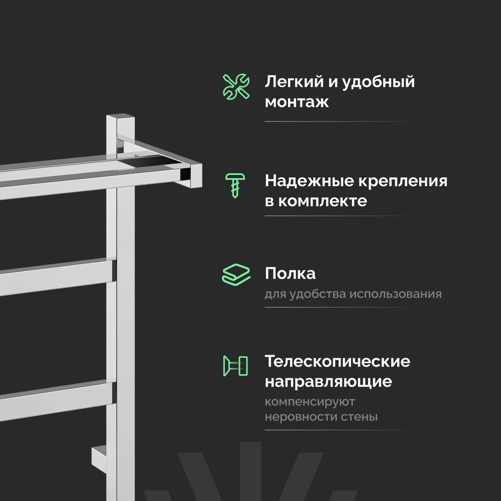 Полотенцесушитель электрический EWRIKA Пенелопа КВ7 60х50 с полкой, хром — это неотъемлемая часть вашего ванной комнаты, сочетающая в себе стиль и функциональность. Отличаясь элегантным хромированным покрытием, этот прибор обеспечит комфорт и уют, быстро и равномерно нагревая воздух в помещении. Благодаря интегрированному терморегулятору, вы можете всегда поддерживать желаемую температуру.